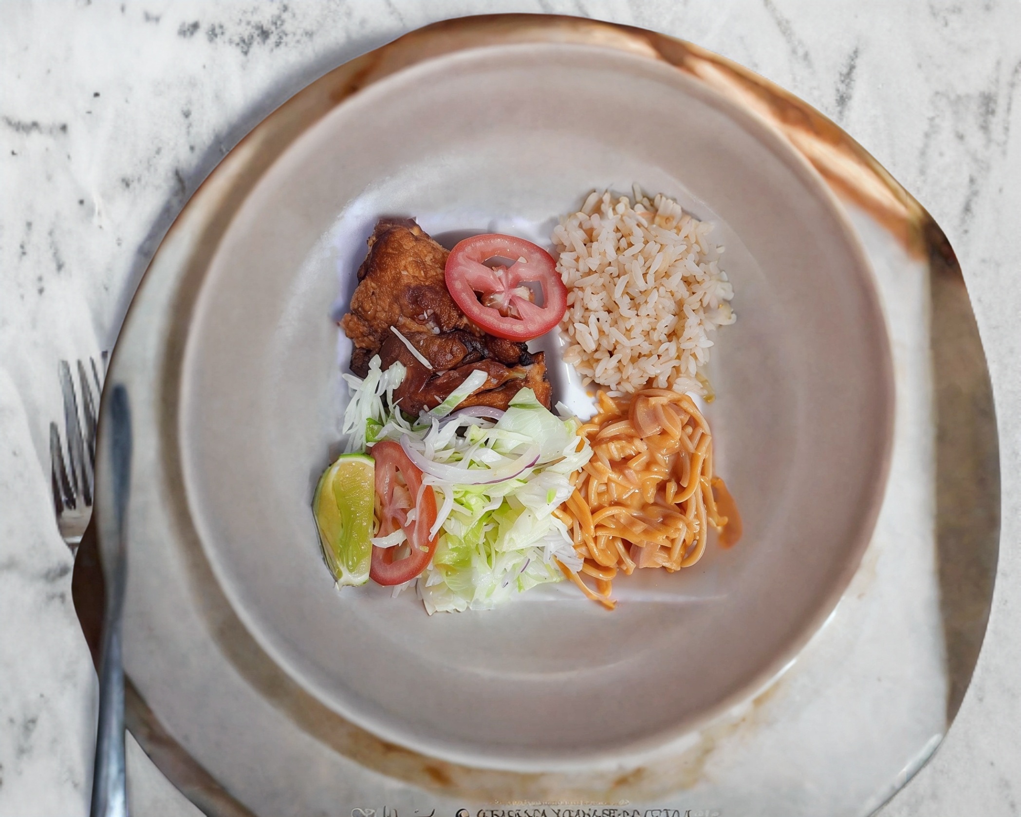 Orden de pollo frito con su arroz y ensalada bien servido