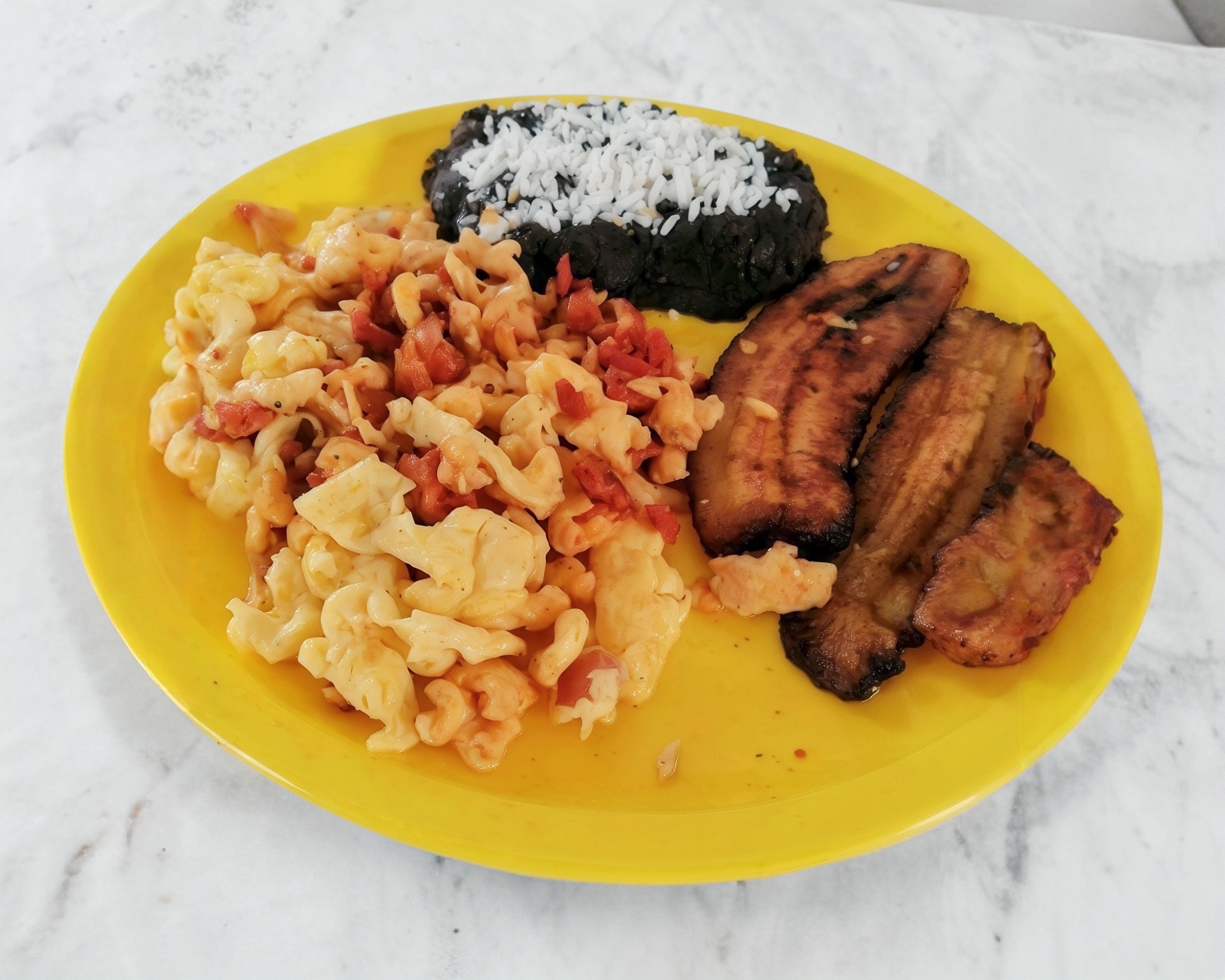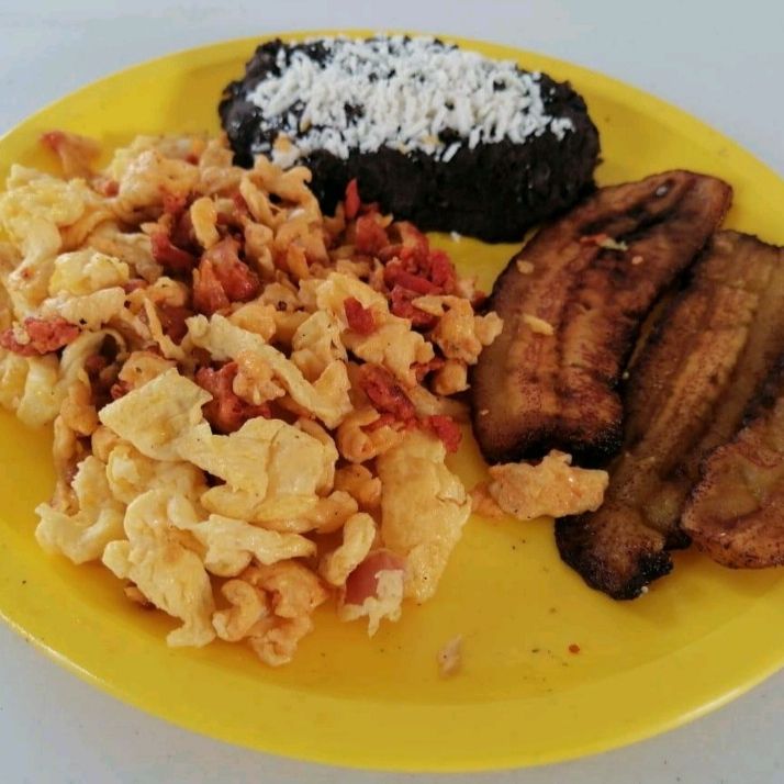 Arroz, Frijoles, plátano frito, huevos al gusto.