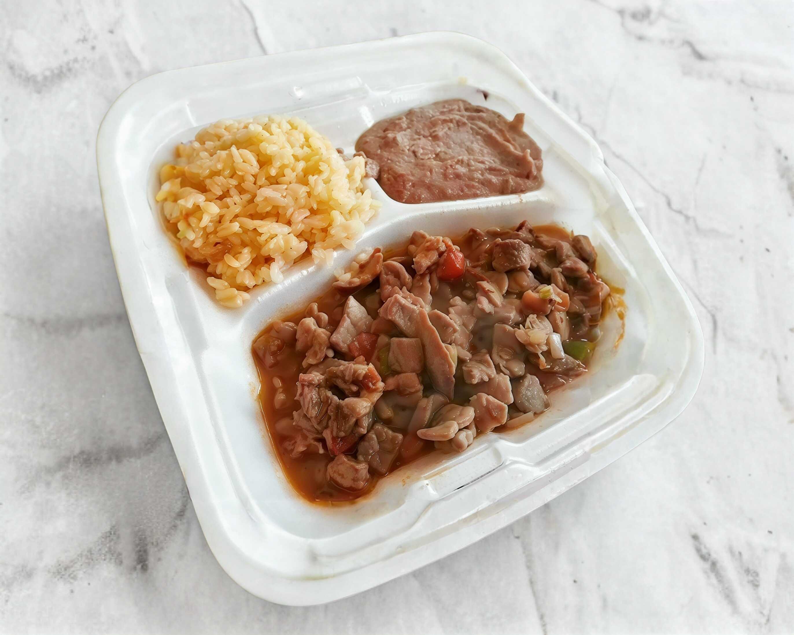 Platillo para dos personas ; Orden de bisteces con frijoles refritos y arroz, con el único sabor casero.