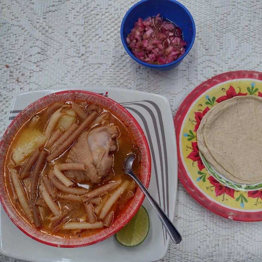 Con el sabor de mamá, gallina con macarrón tortillas y su cebollita