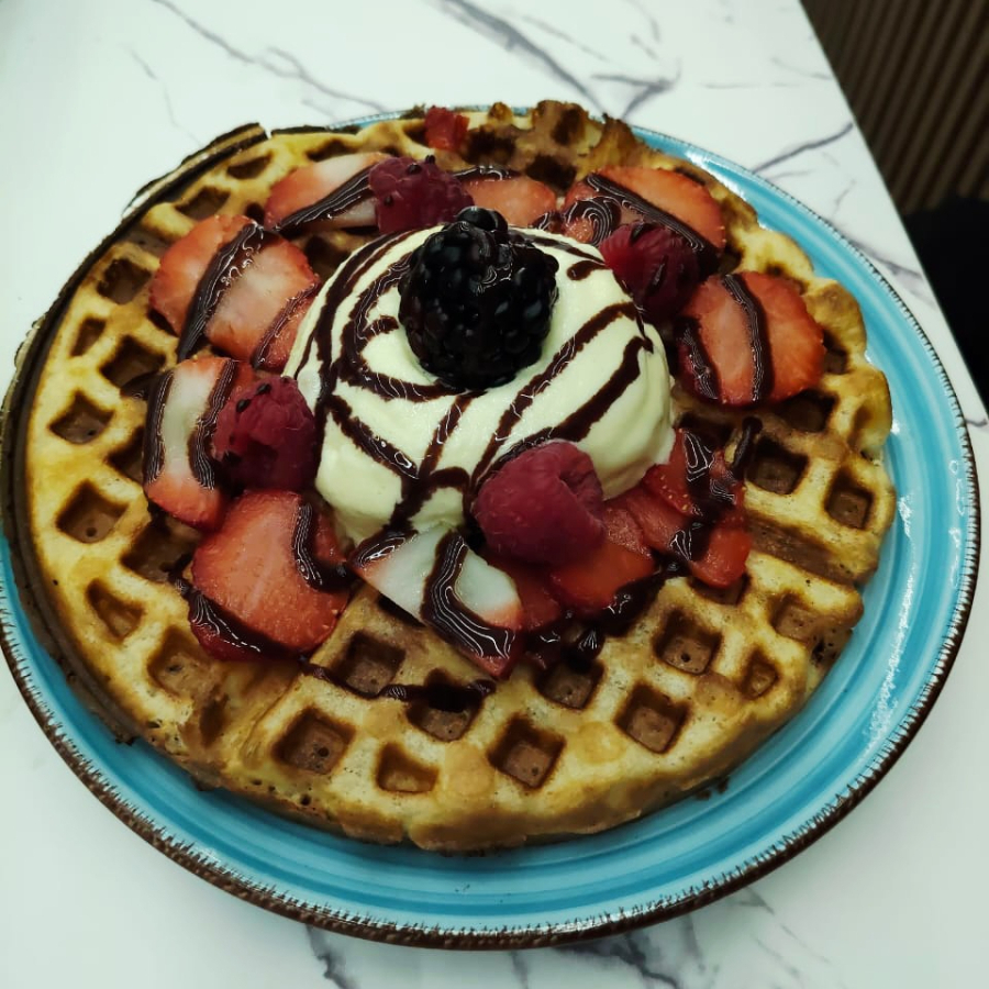 Waffle caliente de 18 cm servido con platano, nutela y crema batida