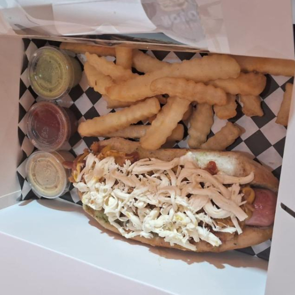 Salchicha de pavo yumbo envuelto con tocino, cebolla y chile morrón gratinado, aderezo de aguacate con mayonesa, mostaza y cátsup. Queso de hebra encima, espolvoreado con Chis de chicharon prensado. Incluye 100 gr de papas