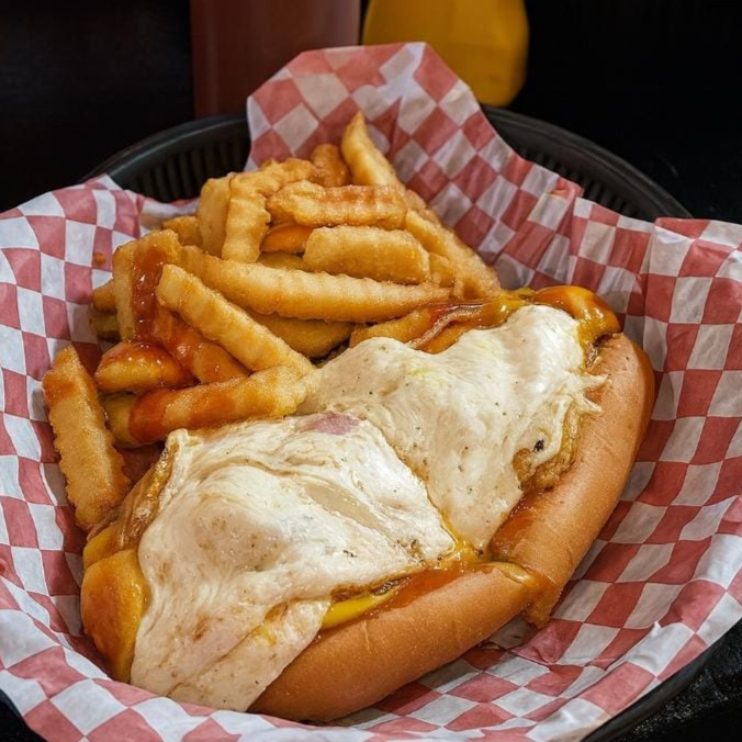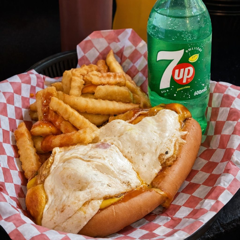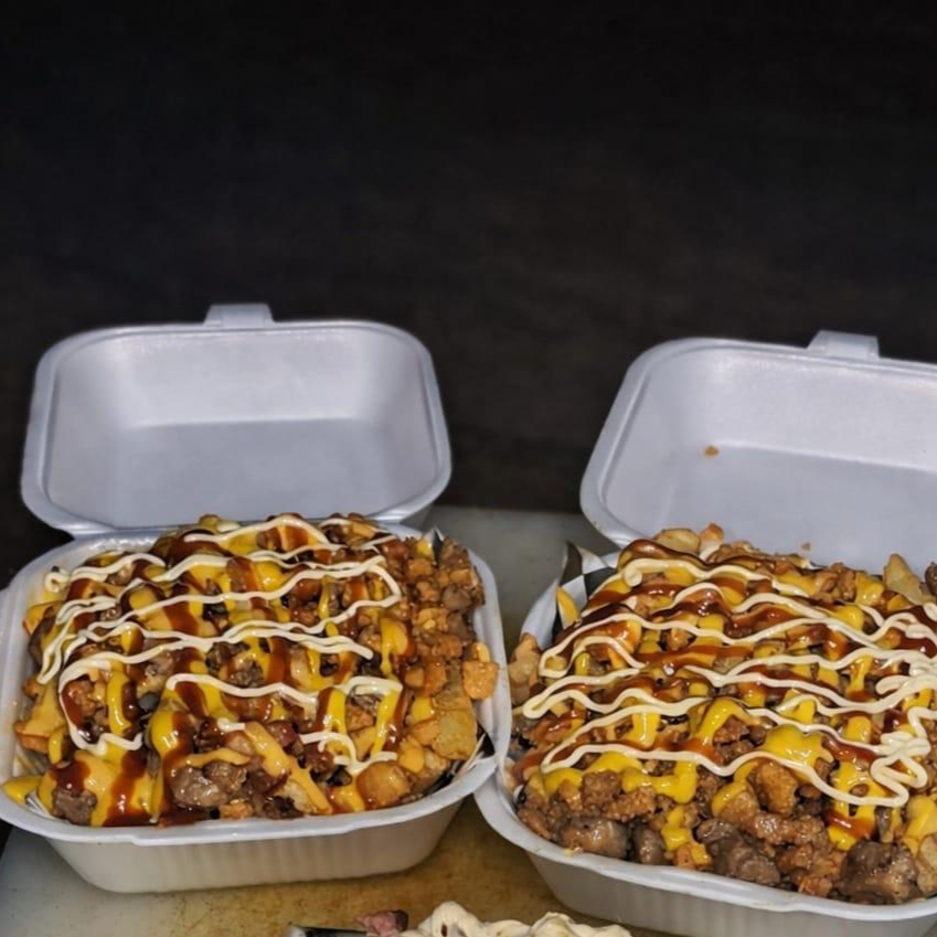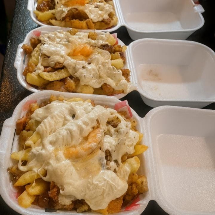Papas fritas con salchicha de pavo, queso amarillo, mostaza, cátsup, porción de camarón fundido en queso de hebra y tocino. (150g de papas)