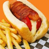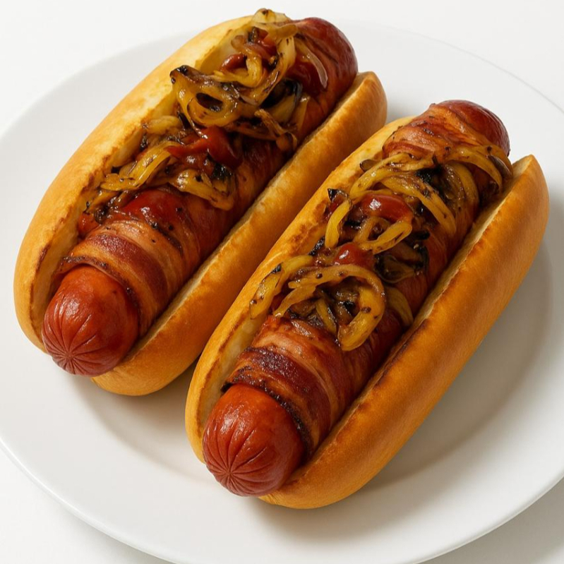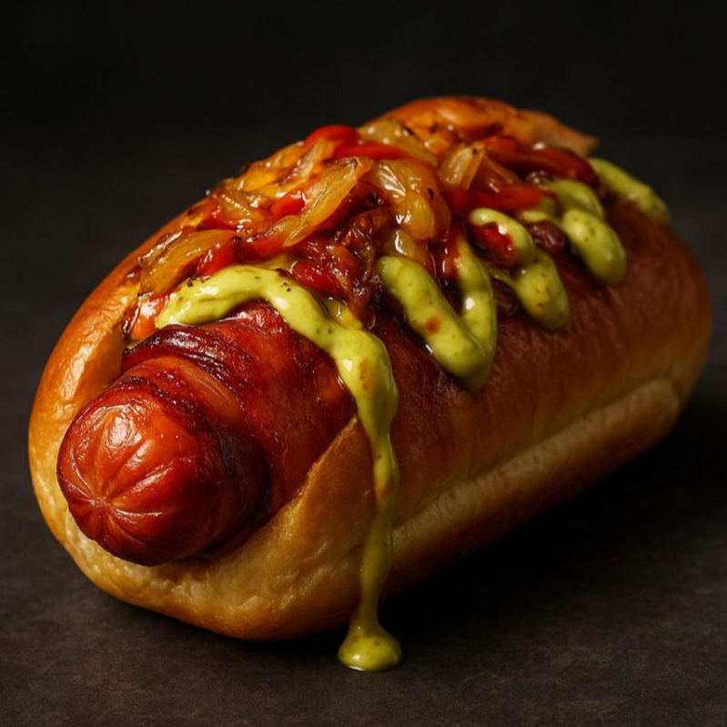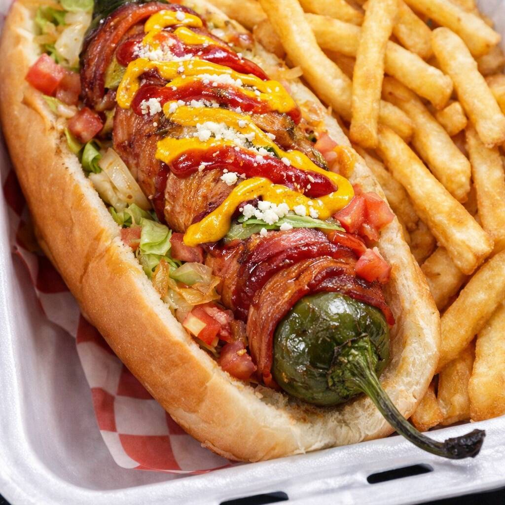 Salchicha de pavo yumbo envuelto con tocino, cebolla y chile morrón gratinado, aderezo de aguacate con mayonesa, mostaza y cátsup. Incluye 100 gr de papas