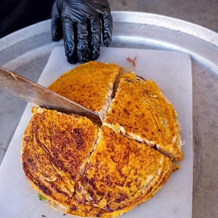 Base y tapa de tortillas de harina que se doran en una plancha con la grasa (consomé) de la birria para obtener una textura crujiente. Carne de res y queso gartinado. Opcion: Cebolla y cilantro