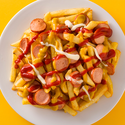 Papas fritas con salchicha roja y de pavo en trocitos, queso amarillo, mostaza y cátsup. (150g de papas)