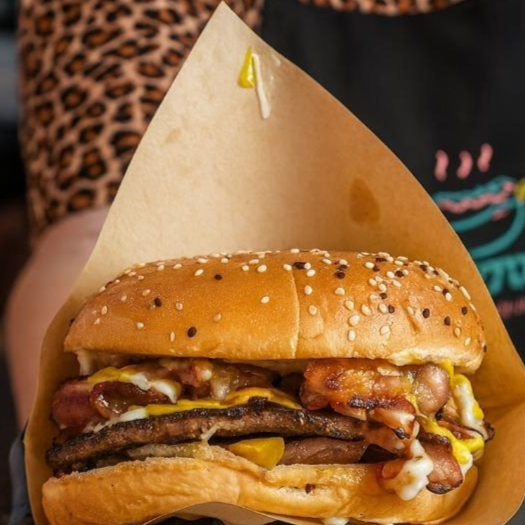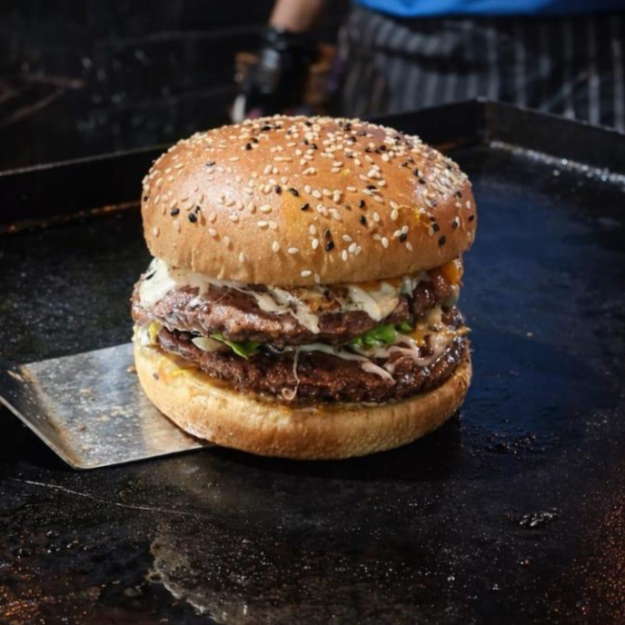 Doble carne de 100 gr cada una de res, pan brioche, queso gratinado de hebra, lechuga fresca, rodajas de jitomate, cebolla gratinada con pimiento morrón y tocino picado, guacamole Incluye 100 gr de papas