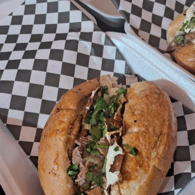 Pan Bolillo relleno generosamente con carne de birria deshebrada y jugosa, aderezo de mayonesa y queso gratinado. Opcional: Cebolla y cilantro picado