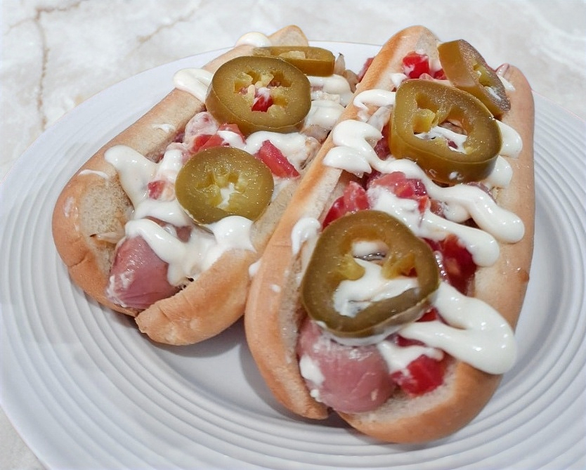 2 HOT DOG, ACOMPAÑADOS DE CEBOLLA, TOMATE, MAYONESA, CATSUP Y CHILE EN RAJAS