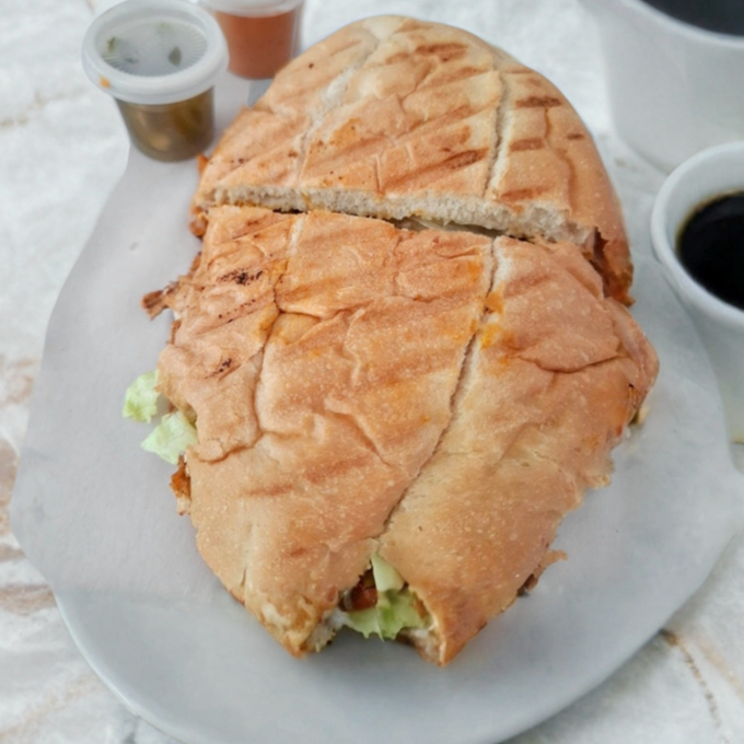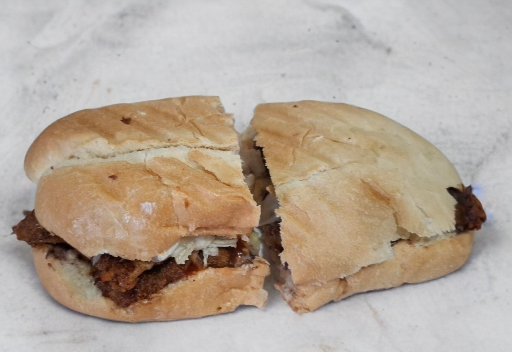TORTA DE MILANESA DE POLLO, ACOMPAÑADA DE LECHUGA, CEBOLLA, FRIJOLES, TOMATE, MAYONESA, CHILE EN RAJAS Y ADEREZO CHIPOTLE
