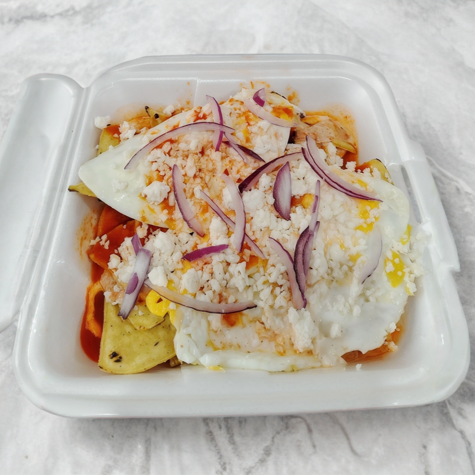 CHILAQUILES CON POLLO, BAÑADOS EN SALSA ROJA, ACOMPAÑADOS DE CEBOLLA, CREMA, QUESO Y TOTOPOS CRUJIENTES