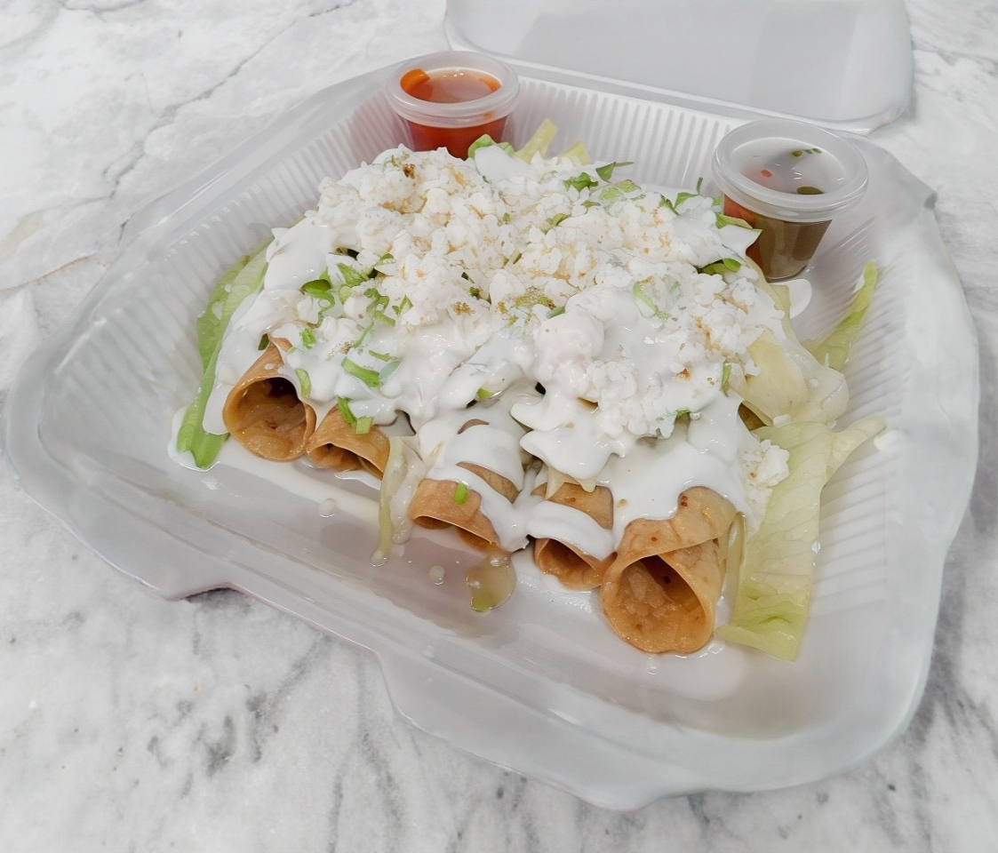 6 FLAUTAS DE POLLO GUISADO, ACOMPAÑADA DE LECHUGA, DELICIOSA CREMA, QUESO, CHILE Y ADEREZO CHIPOTLE