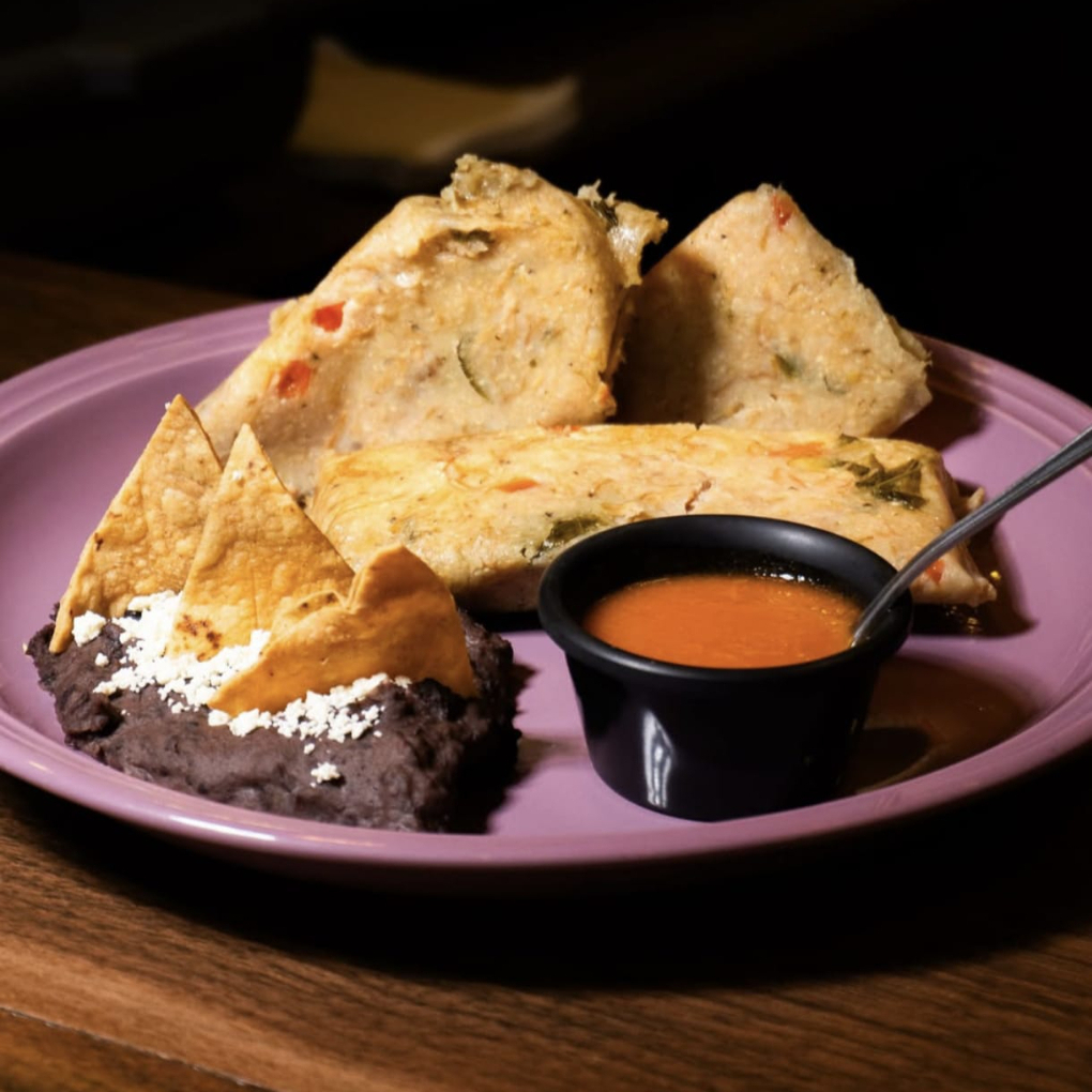 ¡El mejor de la ciudad! Dos suaves tamales con chipilín y carne de cerdo.