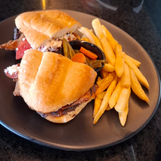 Con pollo guisado, tocino, queso americano, aderezo de la casa y vegetales, acompañado de papas a la francesa.