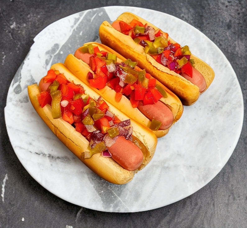 3 hot dog con salchicha de calidad, acompañado de tomate, cebolla, chile en rajas, cebolla frita y catsup