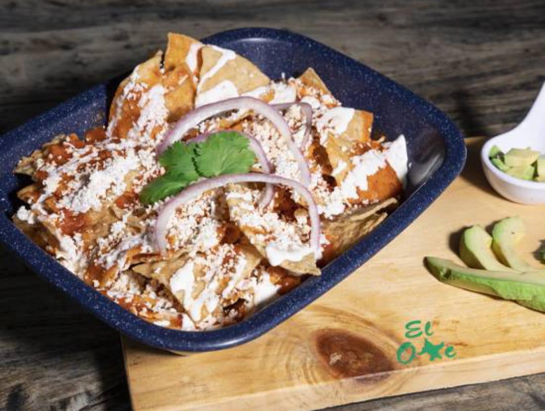 Totopos, Pollo Desebrado, Salsa Roja, Crema, Queso, Cebolla