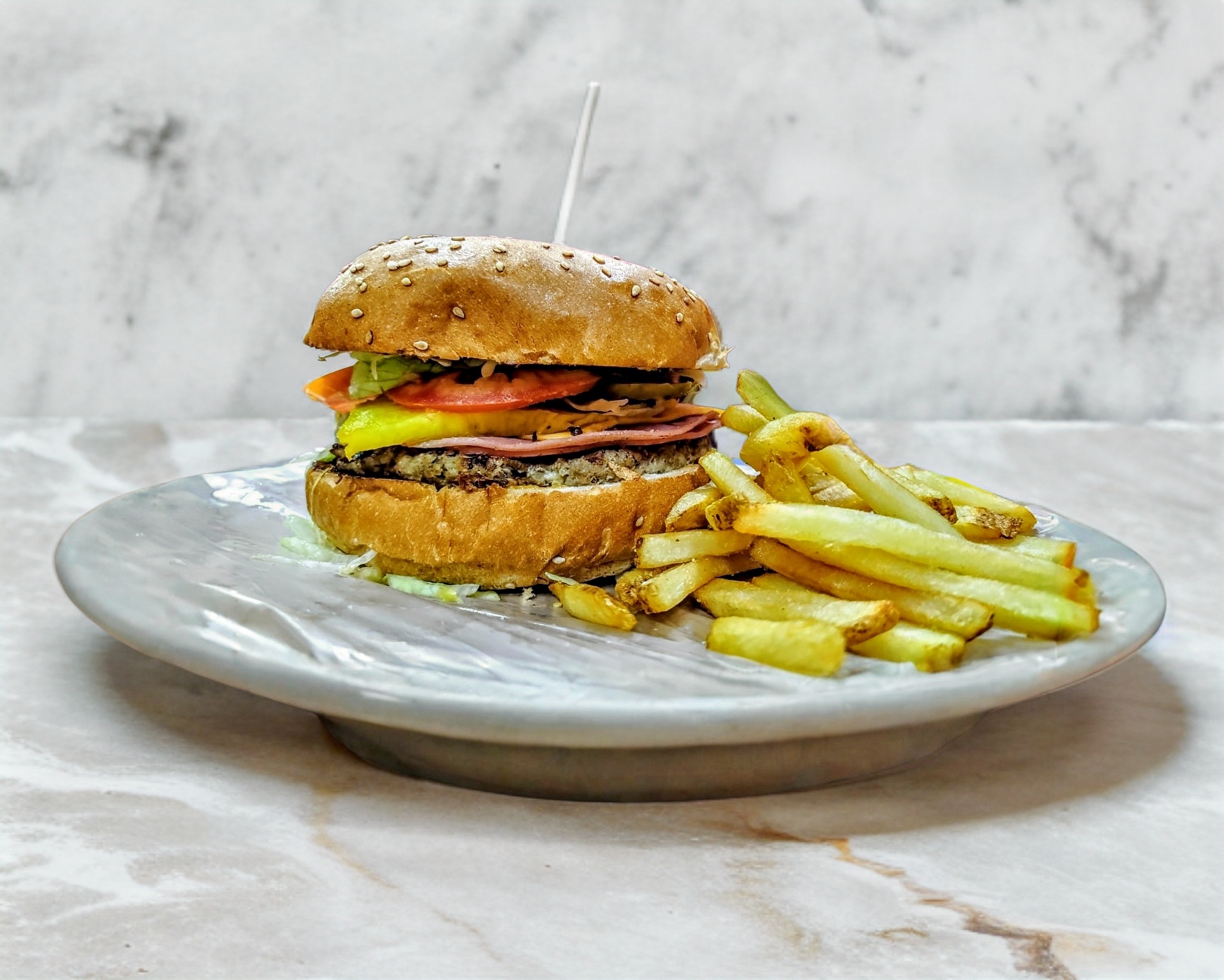 Hamburguesa con 1 carne de res, carne al pastor, carne estilo árabe, tocino, lechuga, tomate, queso de hebra, incluye 100 gm de papas a la francesa. incluye: cátsup, chile jalapeño y salsa verde.