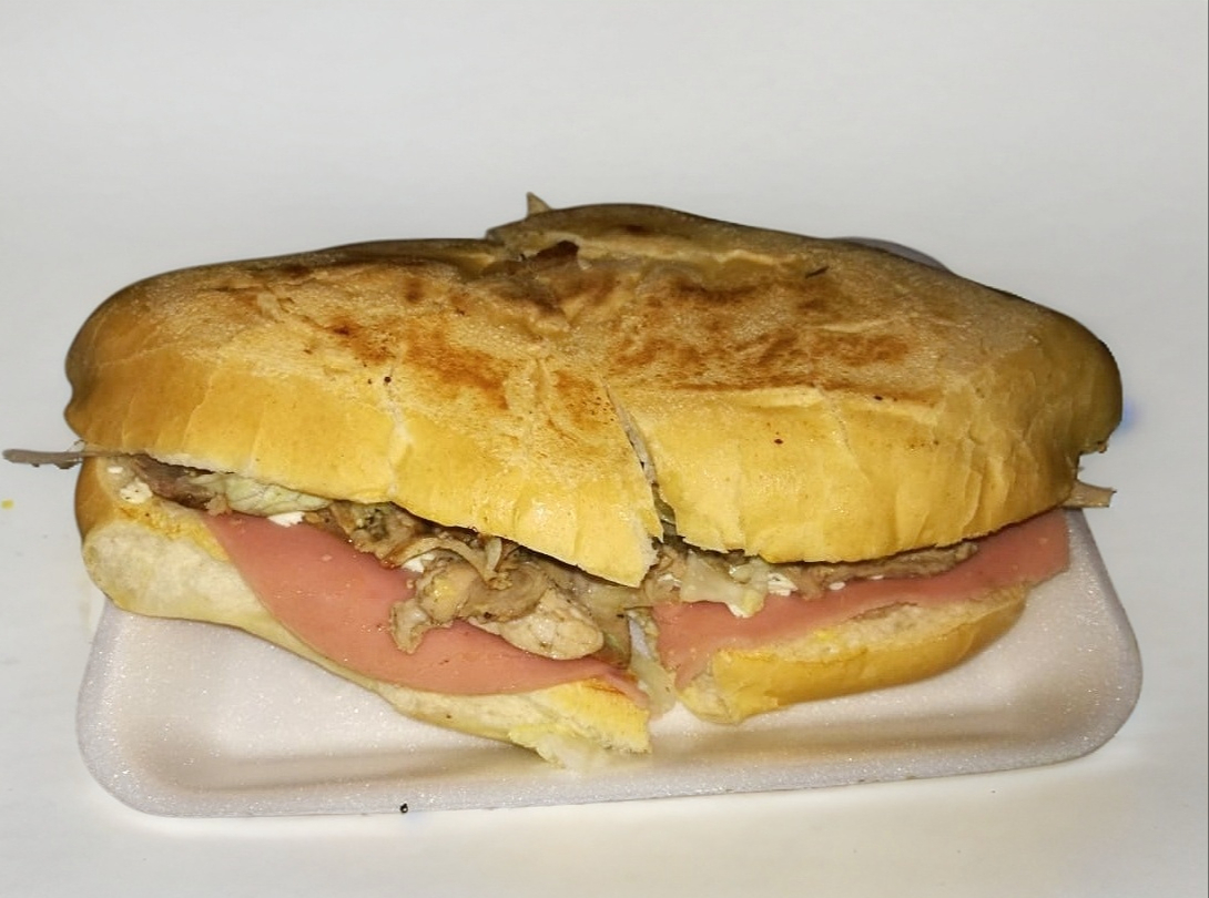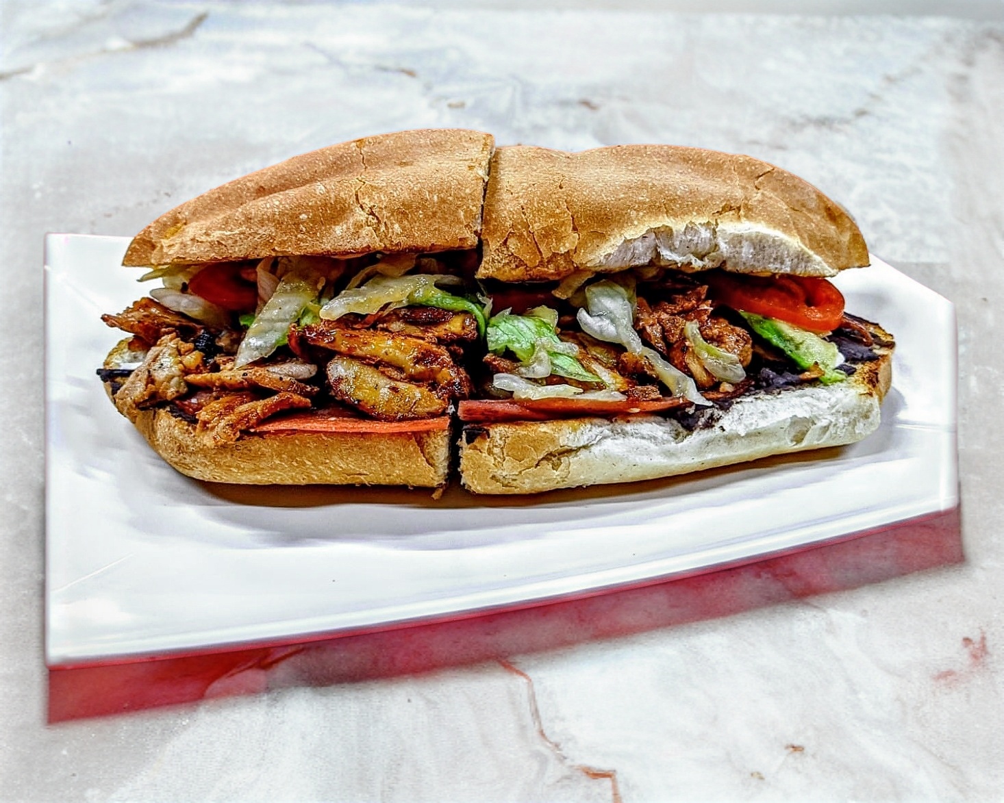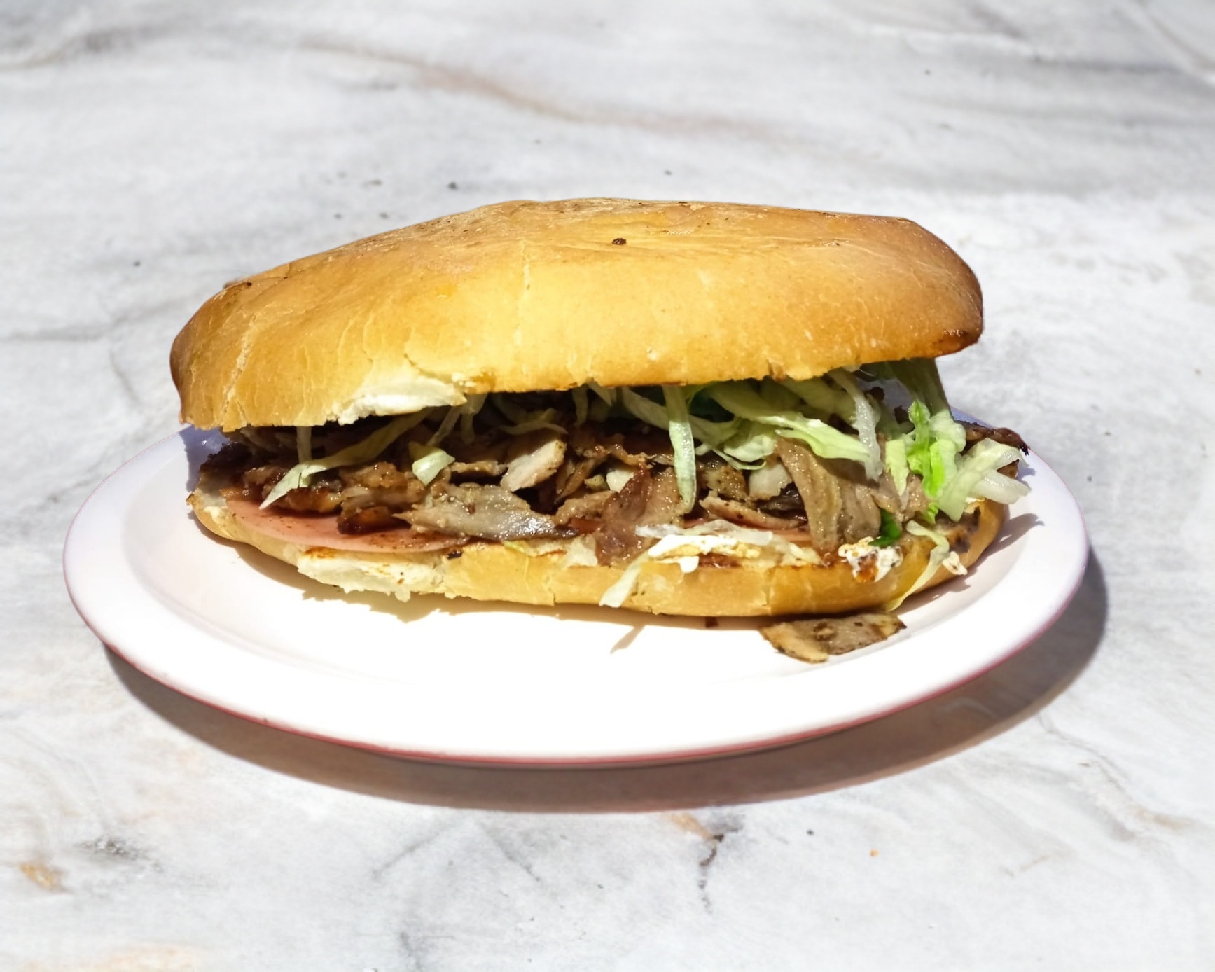 Torta de carne de cerdo estilo árabe con tomate, lechuga, aguacate, frijol, jamón y queso de hebra, incluye limón, salsa mexicana, salsa verde, salsa con chile de árbol.