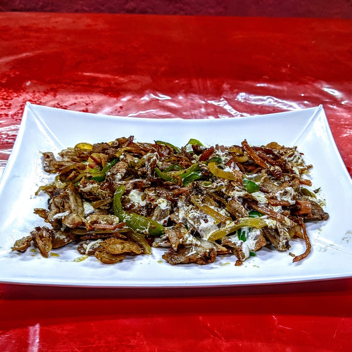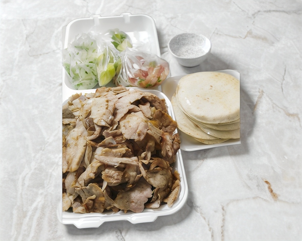 1/2 kg de carne de cerdo estilo árabe, 300gr de tortilla, incluye limón, salsa mexicana, salsa verde, salsa con chile de árbol, chipotle y crema de ajo.