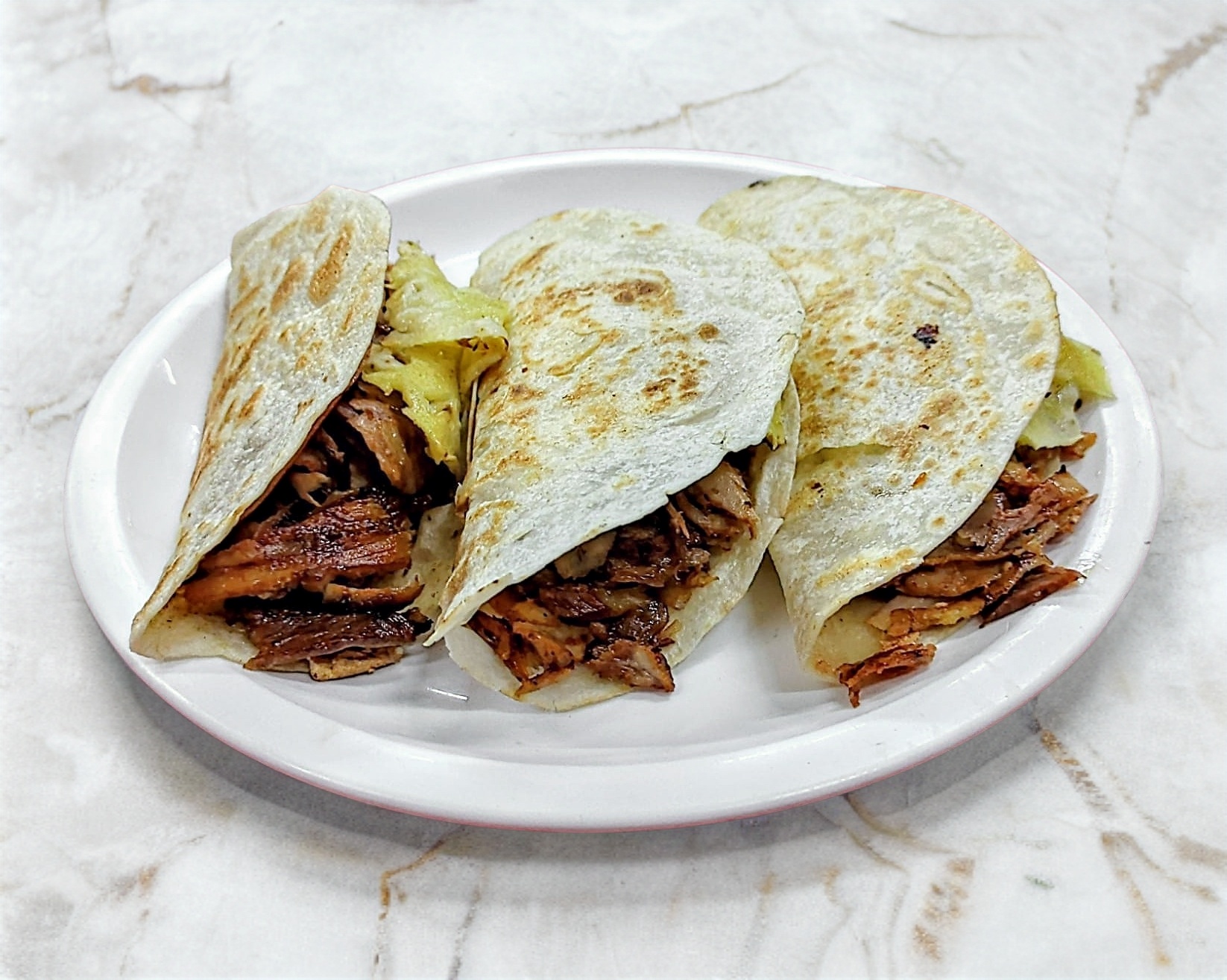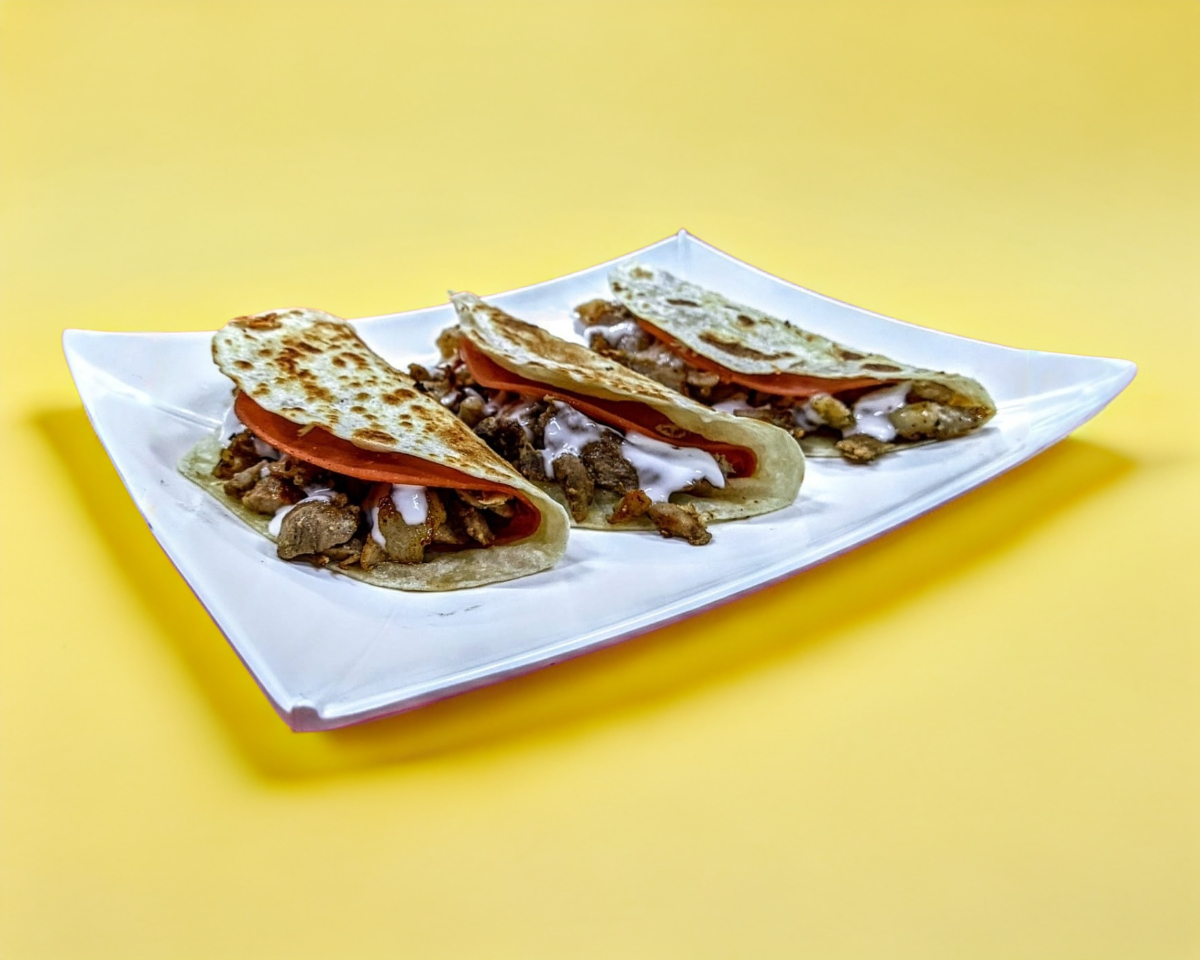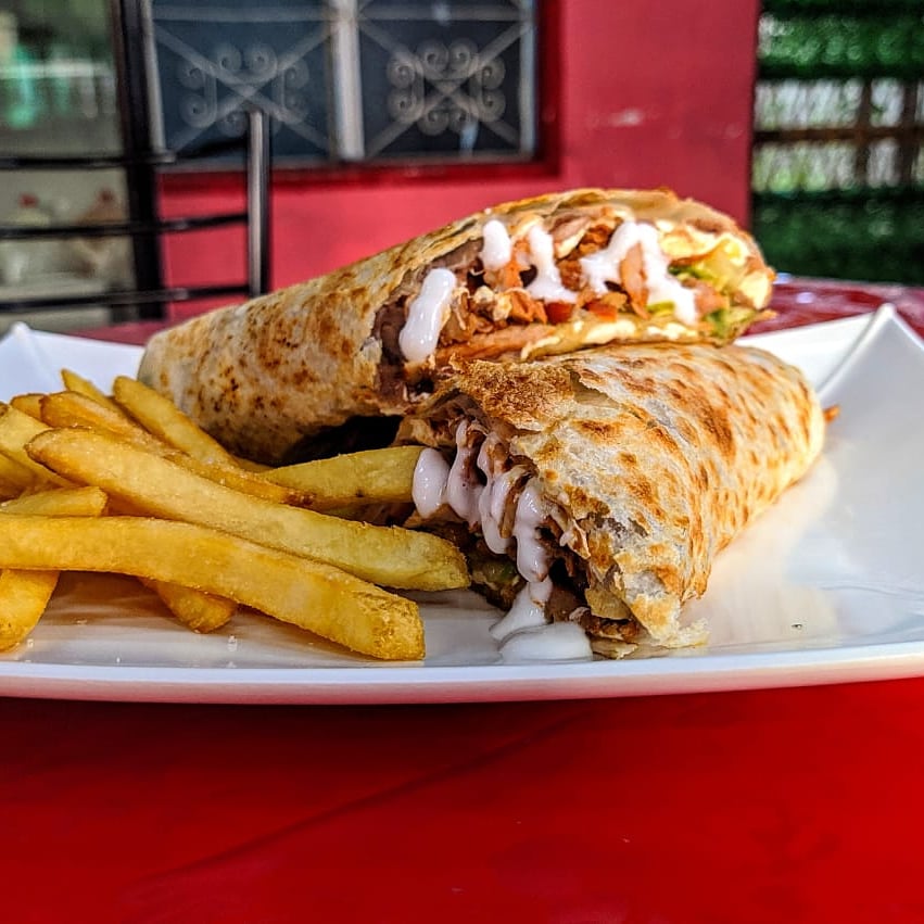 TORTILLA DE HARINA GRANDE, CARNE DE CERDO ESTILO ARABE, FRIJOLES, QUESO DE HEBRA, TOMATE, AGUACATE, LECHUGA. INCLUYE: LIMON, SALSA MEXICANA, SALSA VERDE, SALSA DE CHILE DE ARBOL, CHIPOTLE Y CREMA DE AJO.