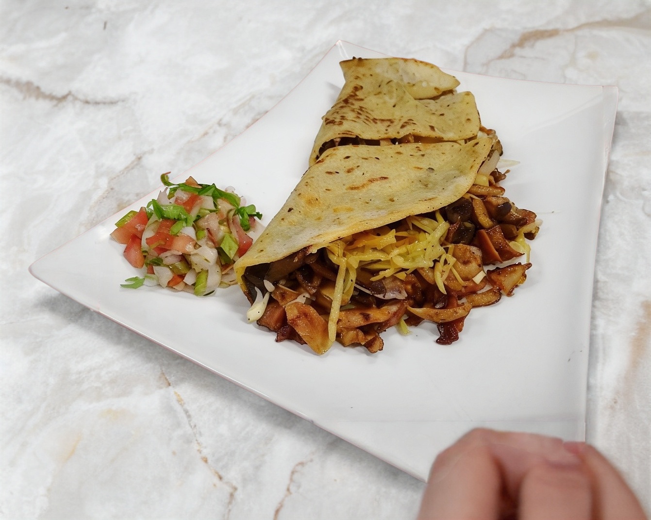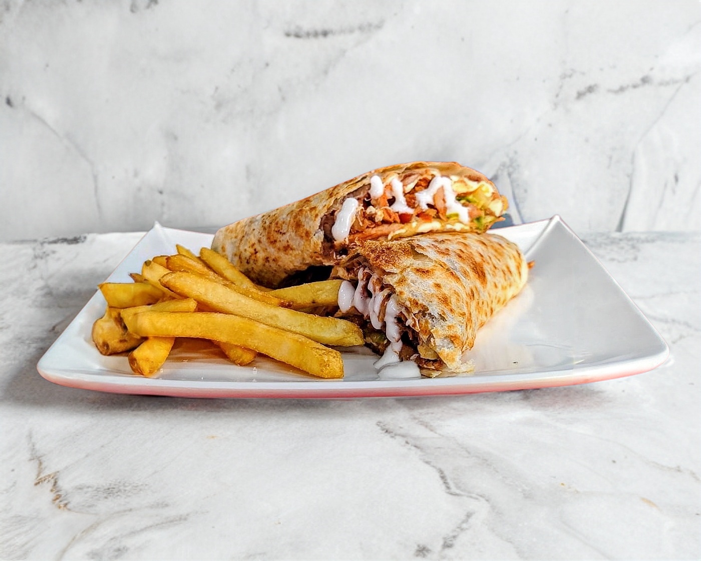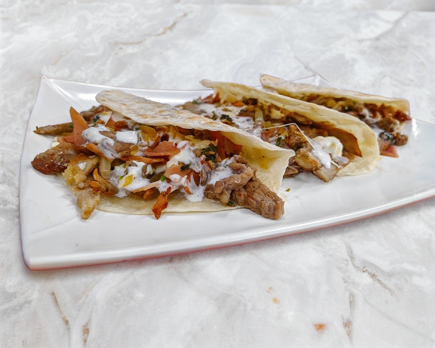TORTILLA DE HARINA GRANDE, CARNE DE CERDO ESTILO ARABE, FRIJOLES, QUESO DE HEBRA, TOMATE, AGUACATE, LECHUGA. INCLUYE: LIMON, SALSA MEXICANA, SALSA VERDE, SALSA DE CHILE DE ARBOL, CHIPOTLE Y CREMA DE AJO.