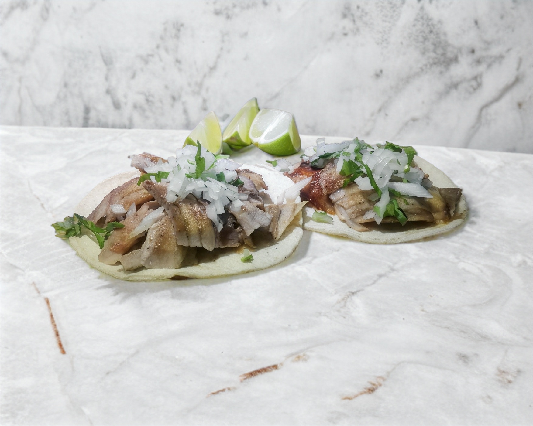 Taco de carne de cerdo tipo árabe con tortilla chica con cebolla y cilantro, incluye limón, salsa mexicana, salsa verde, salsa con chile de árbol.