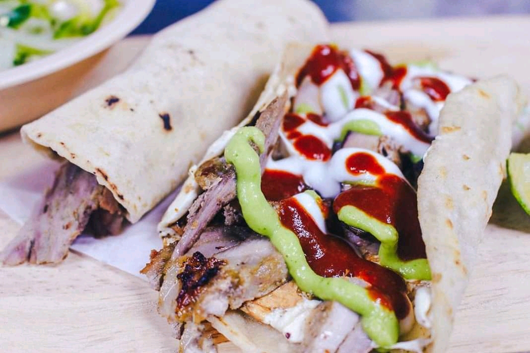 Tortilla de harina grande, carne de cerdo al pastor, frijoles, queso de hebra, tomate, aguacate, lechuga. incluye: limón, salsa mexicana, salsa verde, salsa de chile de árbol, chipotle y crema de ajo.