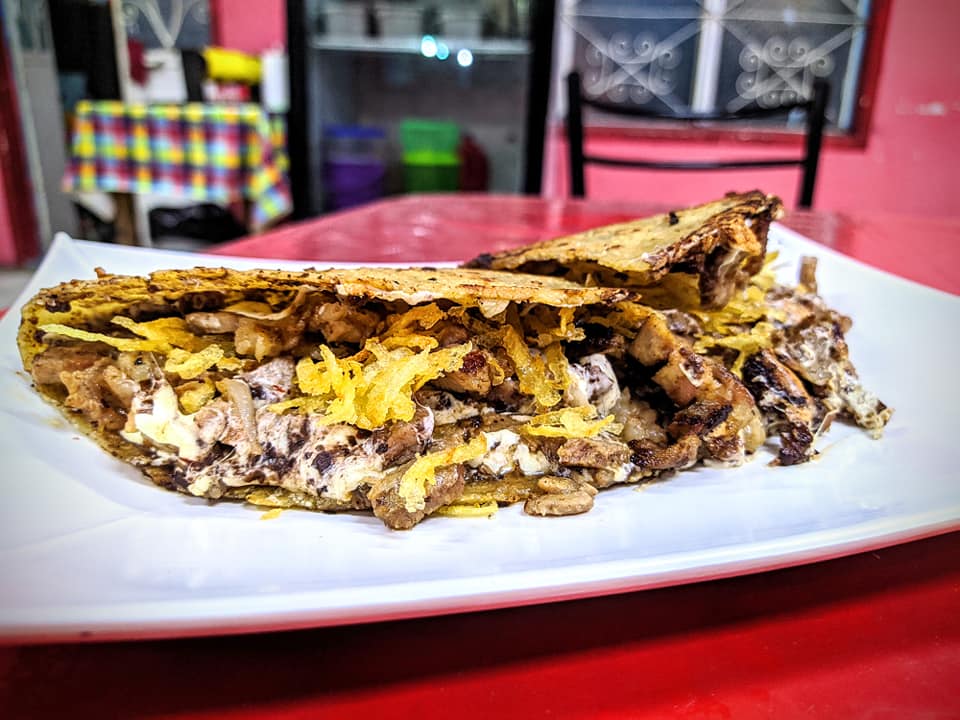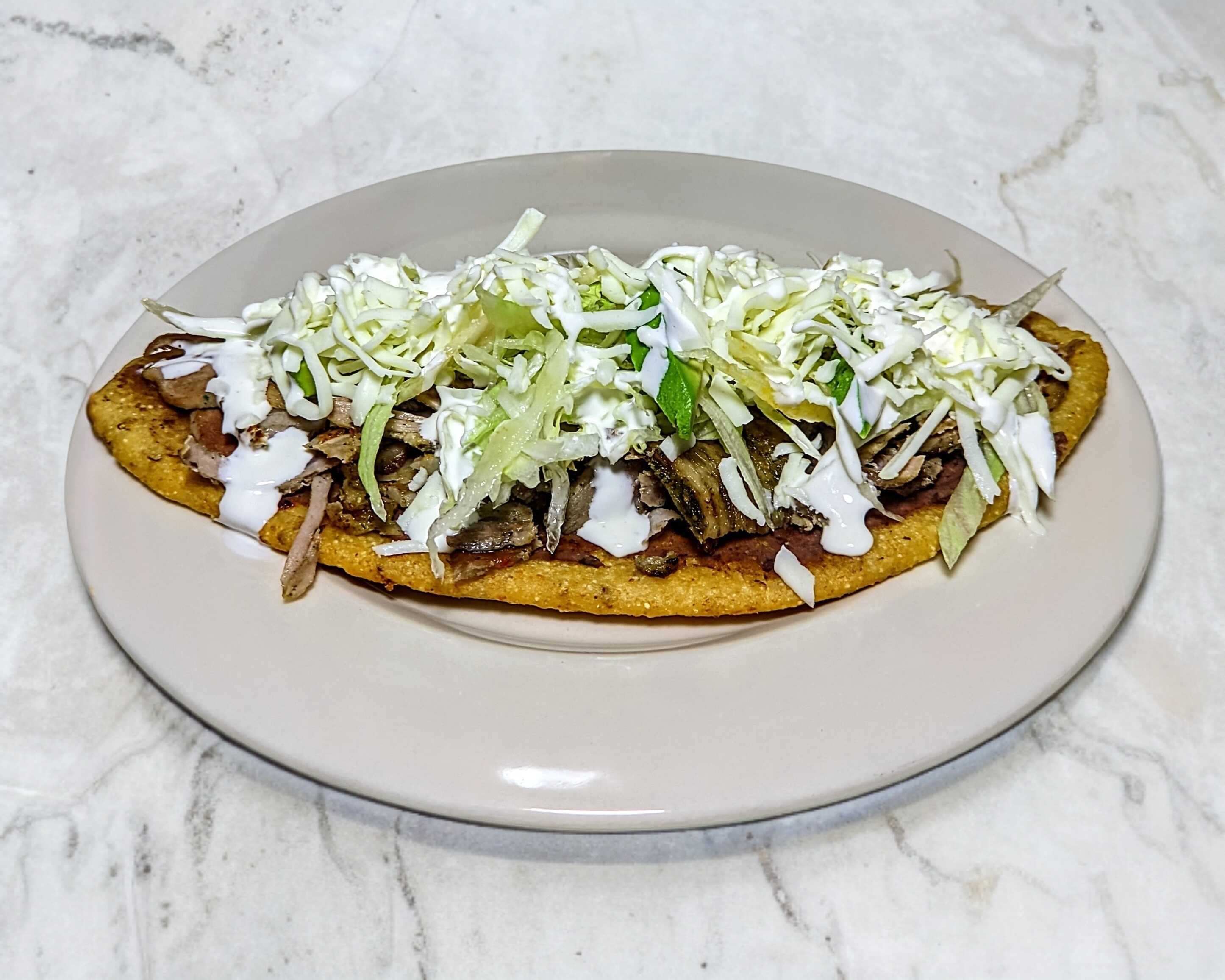 Tortilla gruesa con frijoles refritos, de carne árabe, al pastor, o carne asada, lleva lechuga, queso y crema.
