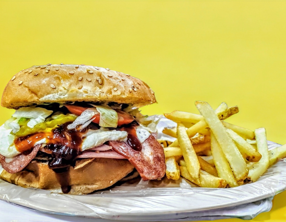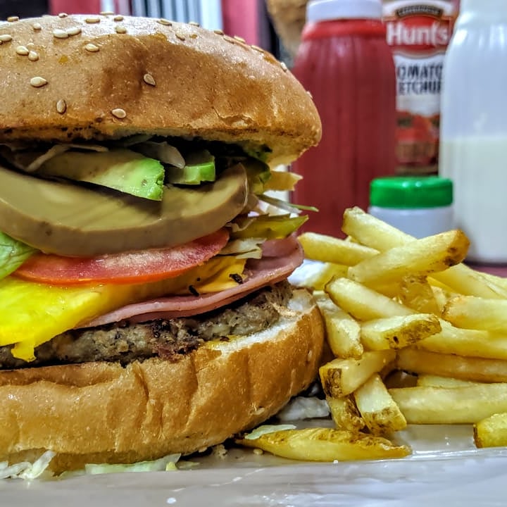 Hamburguesa con 1 carne de res, jamón, piña, lechuga, tomate y queso amarillo incluye 100 gm de papas a la francesa. incluye: cátsup, chile jalapeño y salsa verde.