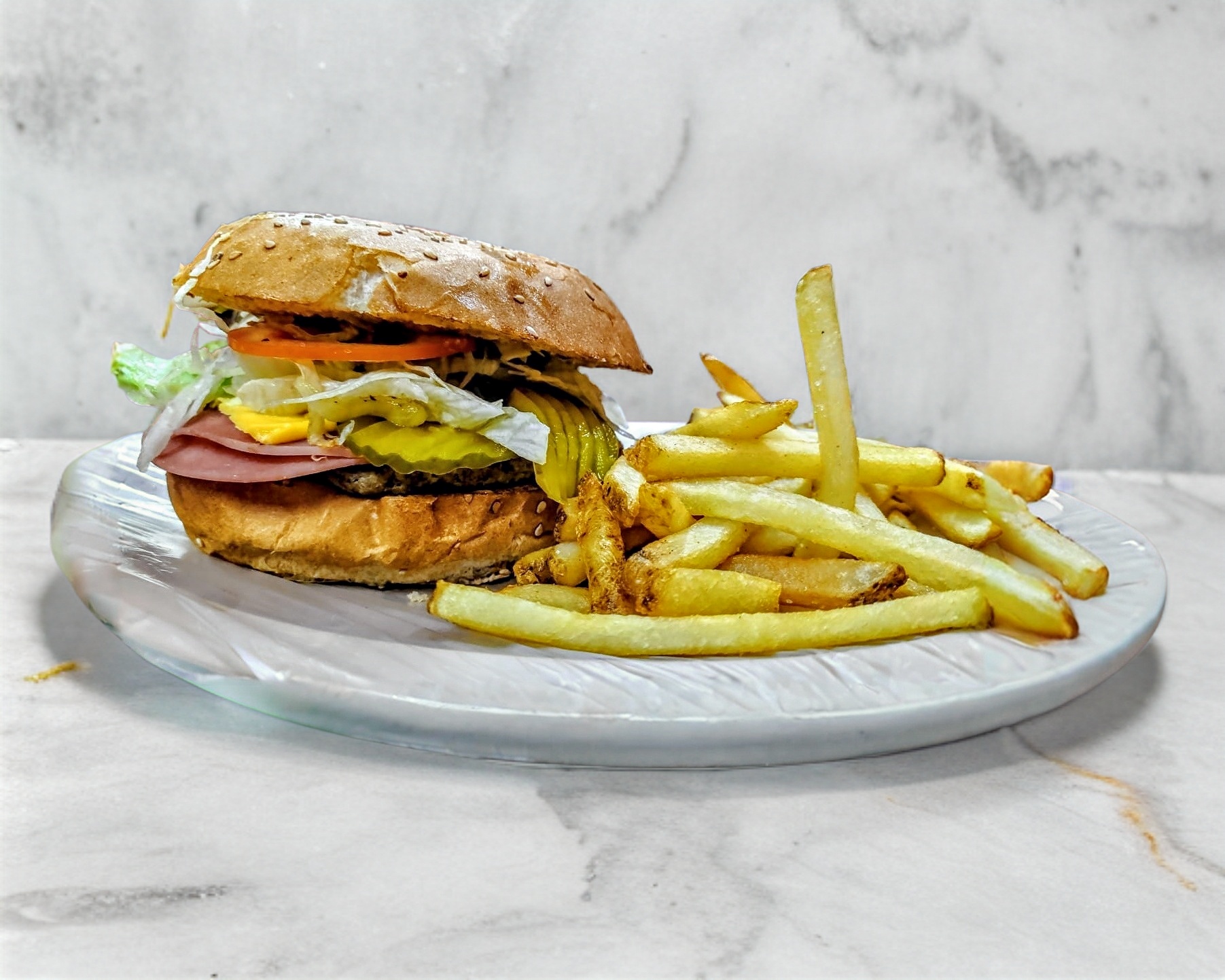 Hamburguesa con 1 carne de res, jamón, lechuga, tomate y queso amarillo incluye 100 gm de papas a la francesa. incluye: cátsup, chile jalapeño y salsa verde.