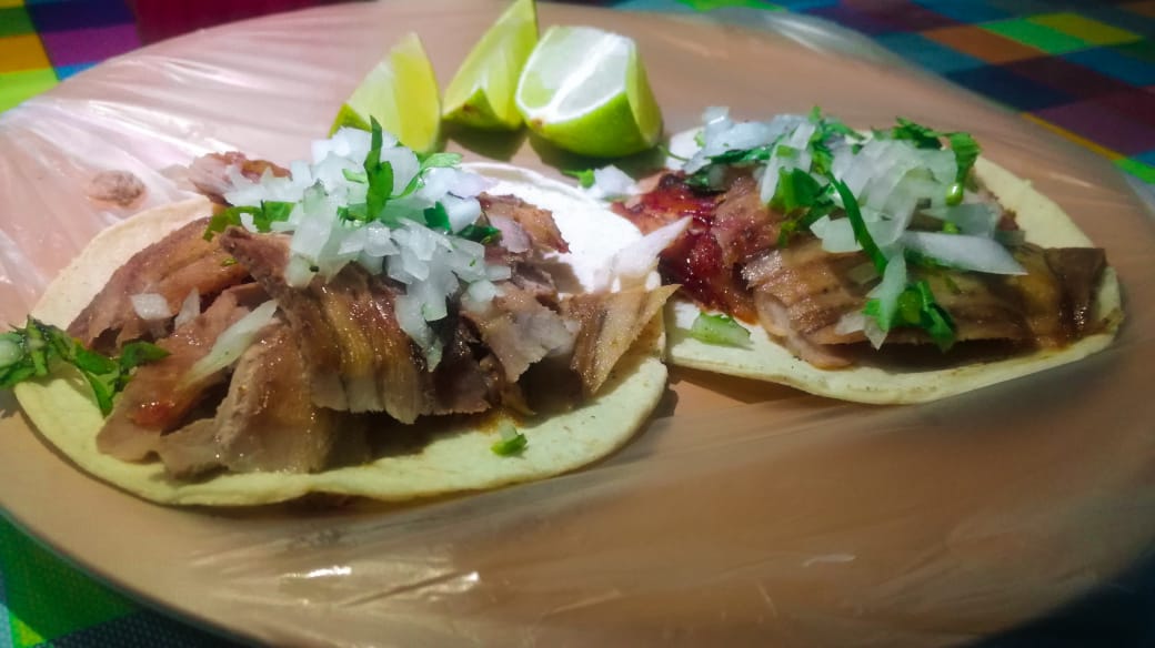 Tortilla grande de maíz hecha a mano de carne de cerdo estilo árabe con frijol, queso de hebra y cebolla frita, incluye: limón, salsa mexicana, salsa verde y salsa de chile de árbol.