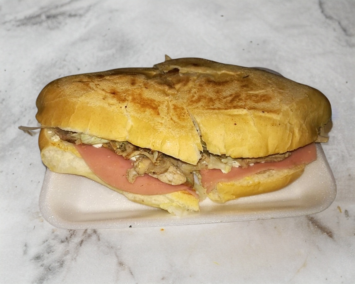 Torta de carne de cerdo al pastor y piña con tomate, lechuga, aguacate, frijol, jamón y queso de hebra, incluye limón, salsa mexicana, salsa verde, salsa con chile de árbol.