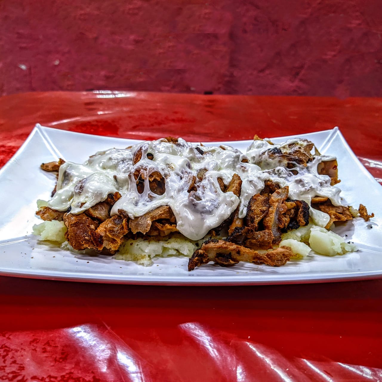 Papa con carne de cerdo al pastor y queso de hebra 2 personas 200 gm de tortilla. incluye limón, salsa mexicana, salsa verde, salsa con chile de árbol.