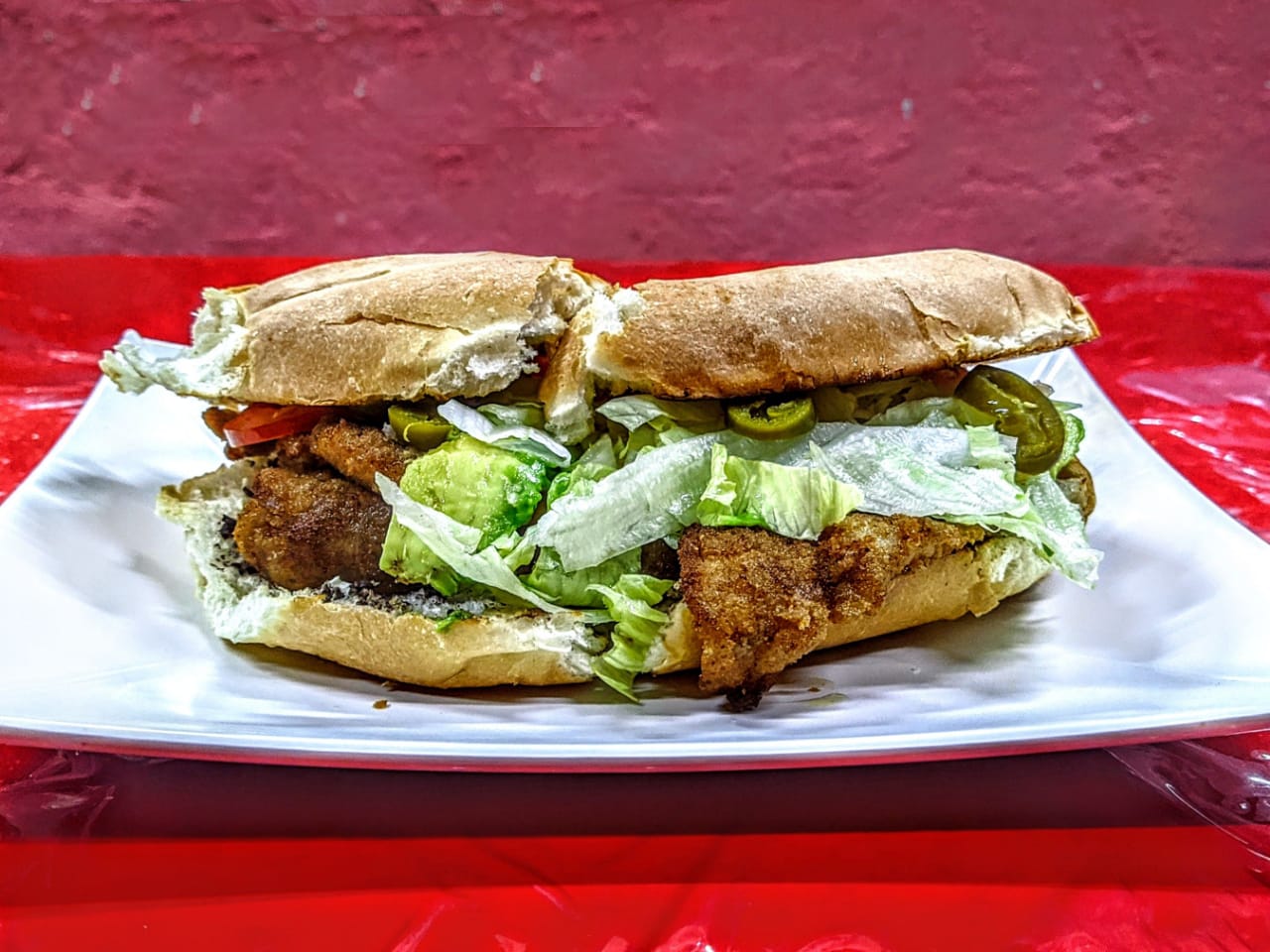 Torta de milanesa de pollo con tomate, lechuga, aguacate, frijol, jamón y queso de hebra, incluye limón, salsa mexicana, salsa verde, salsa con chile de árbol.