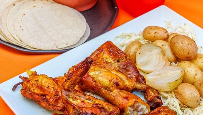 4 piezas de delicioso pollo asado acompañado de salsa, repollo, cebollita, papitas y tortillas