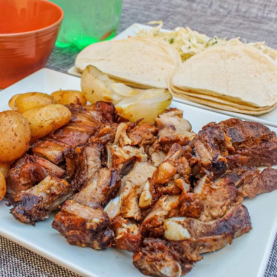 1/2 Kg de deliciosa costilla, acompañada de salsa, tortillas, cebolla y repollo.