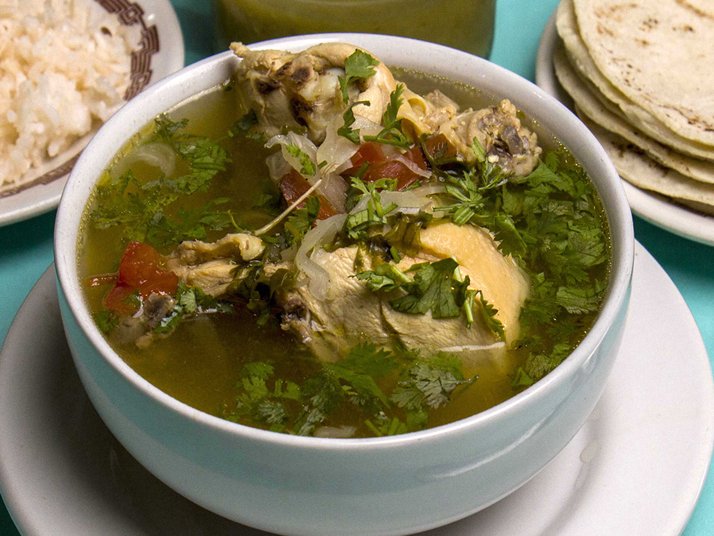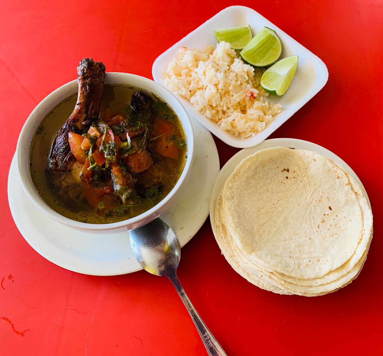 Consomé de pollo acompañado con tortilla, salsa, limón y arroz.