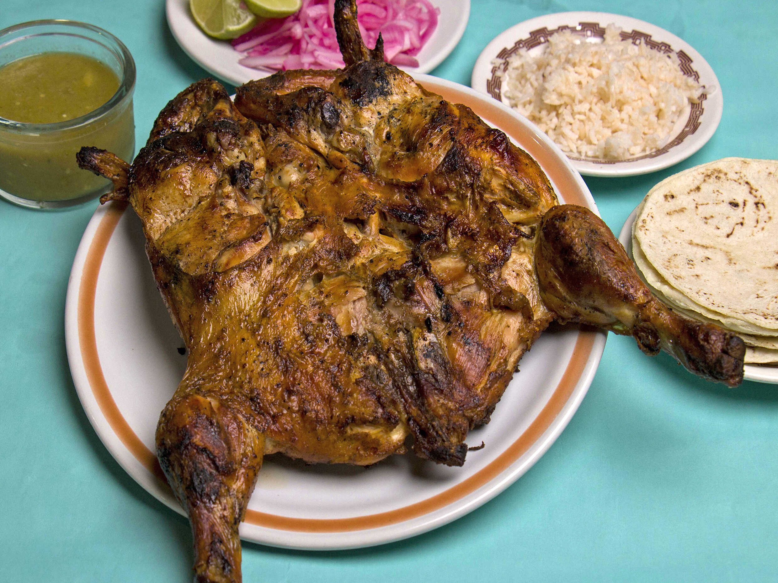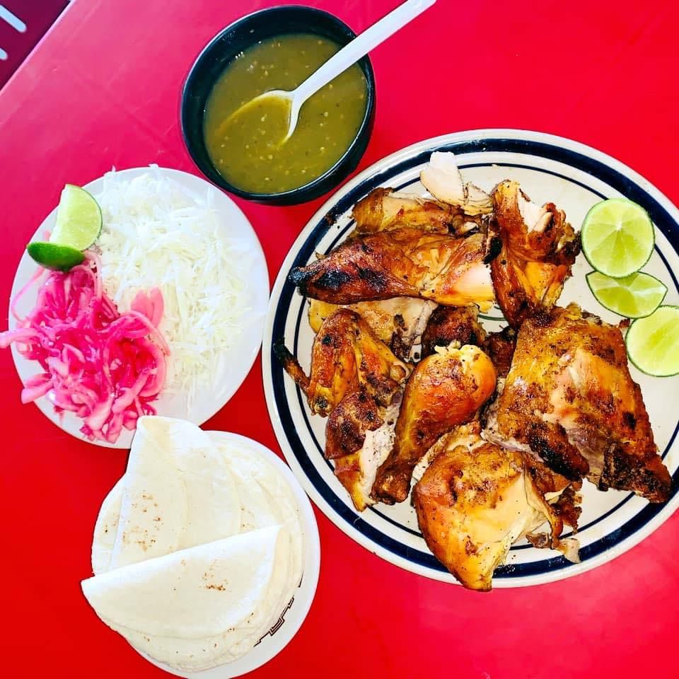 1 1/2 Pollo asado al carbón con salsa, repollo, cebolla, limón, arroz y tortilla.
