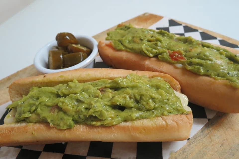 Salchicha, guacamole, queso manchego, tomate, cebolla, catsup y mayonesa.