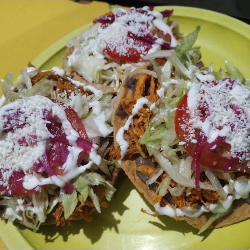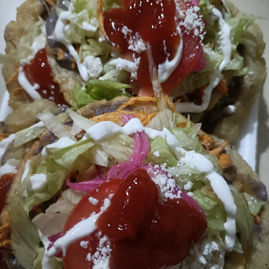 Acompañado con frijol, lechuga, tomate, cebolla, queso, crema y capsu proteína a elejir pierna, pollo y carne de res