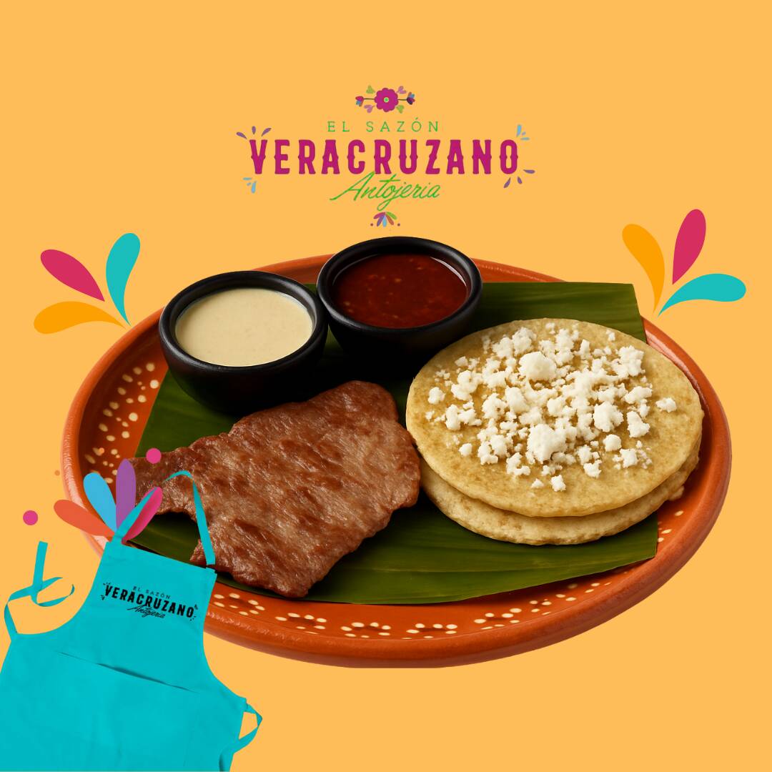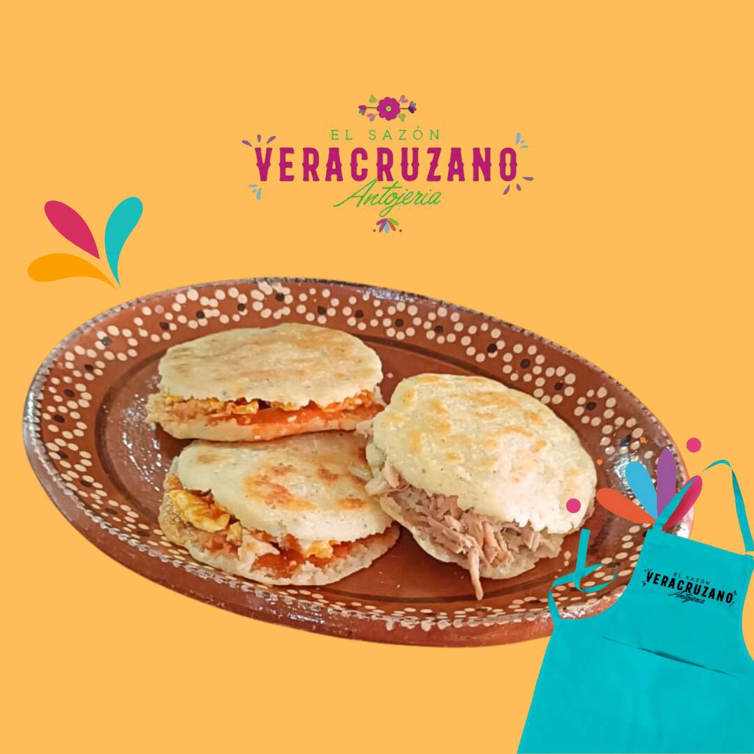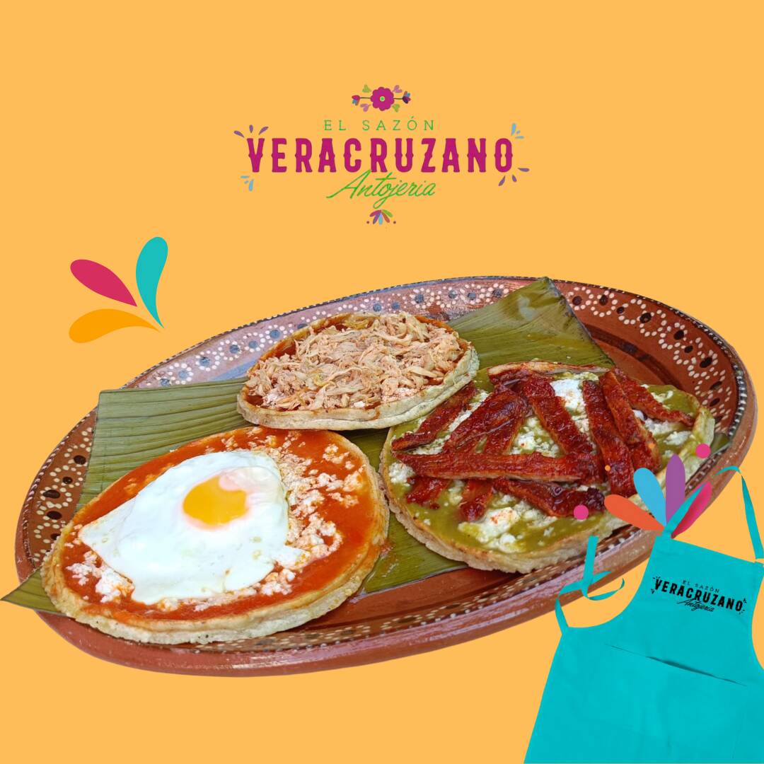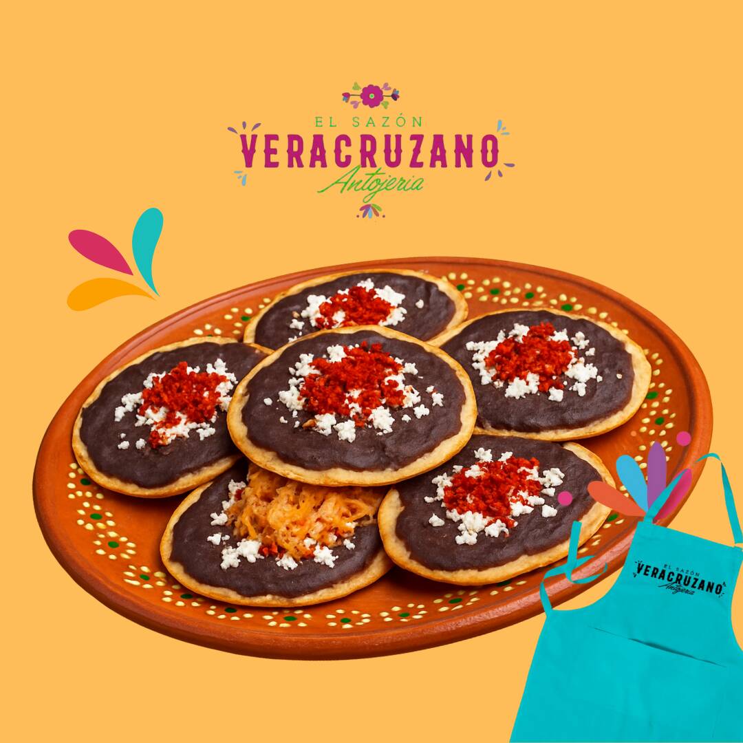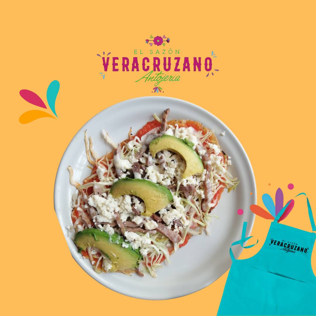 Deliciosa tortilla cocida en comal hecha de masa con frijol, bañada en salsa, cubierta con repollo, queso, crema, aguacate y el complemento de tu elección.