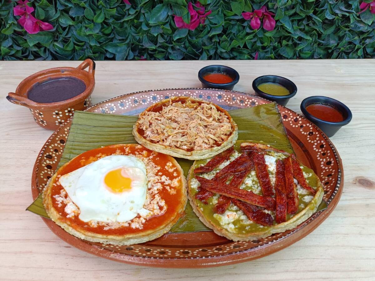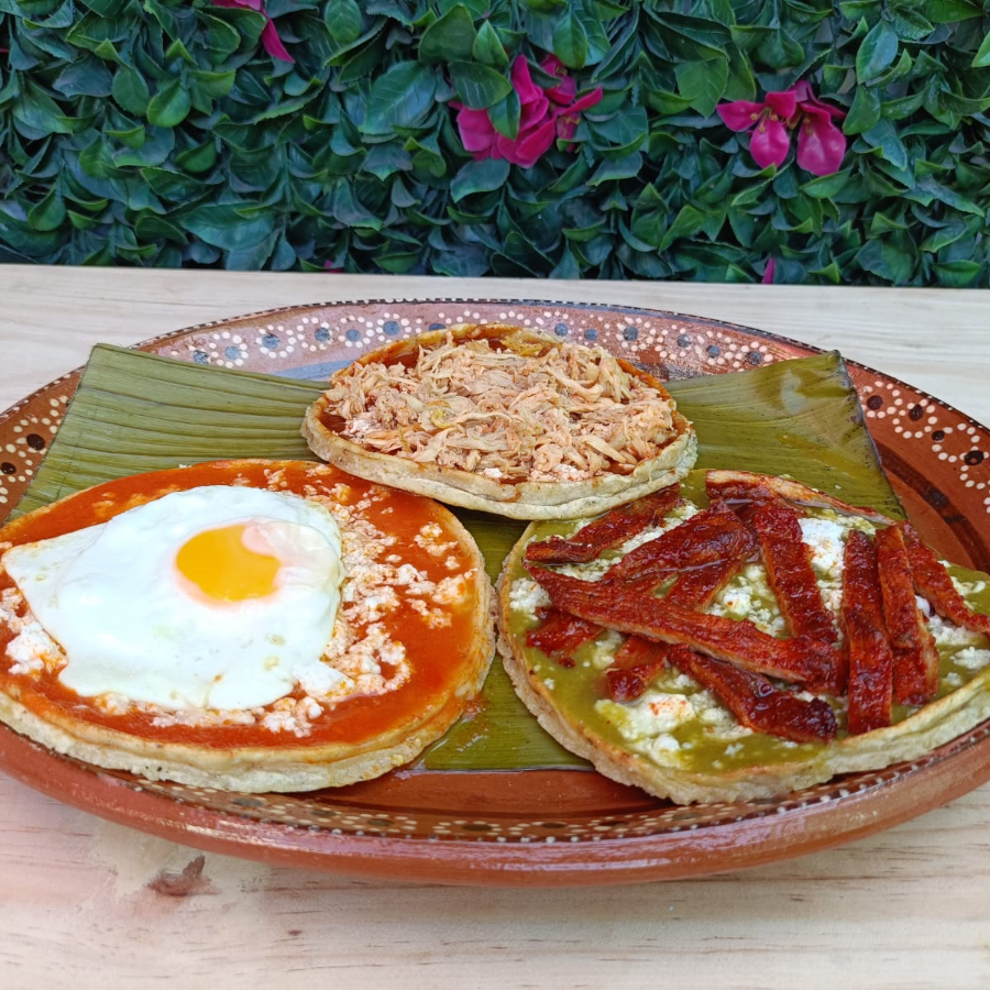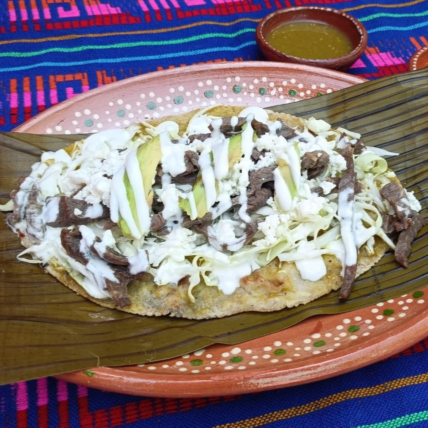 Disfruta una tortilla de masa y frijol cocida en comal, bañada en salsa, con repollo, queso, crema y aguacate fresco y el complemento de tu elección.
