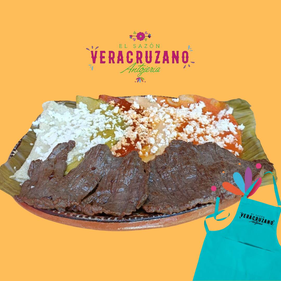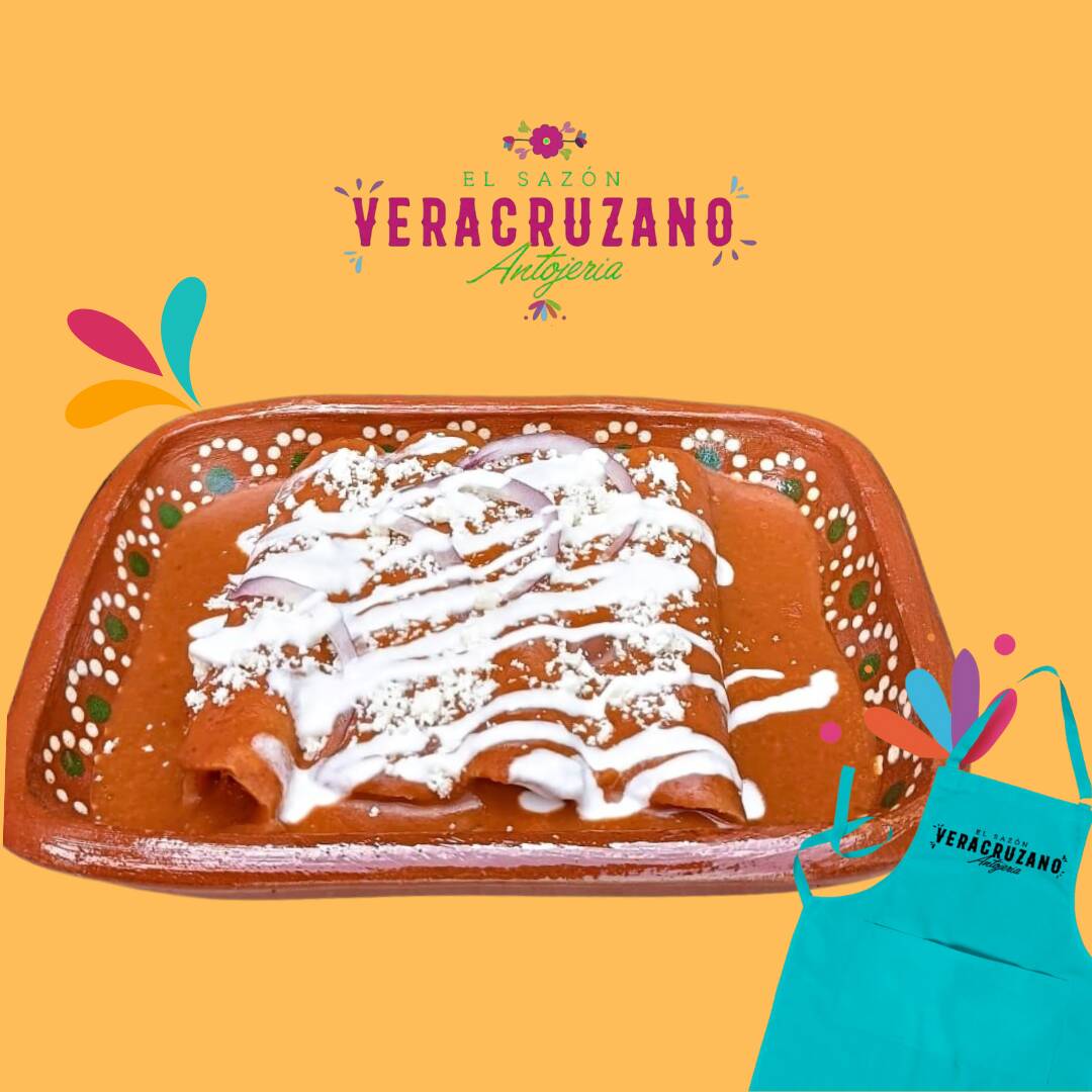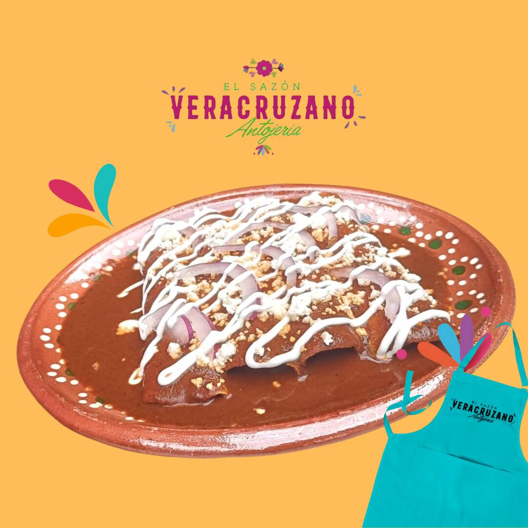 Con base de frijol, montamos 4 enchiladas de tortilla de maíz Nixtamalizada con el relleno de tu elección bañadas en mole artesanal veracruzano, encima queso doble crema y cebolla morada.