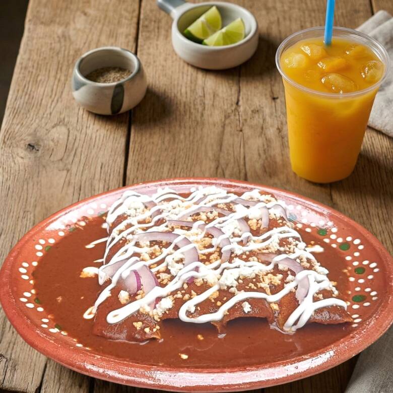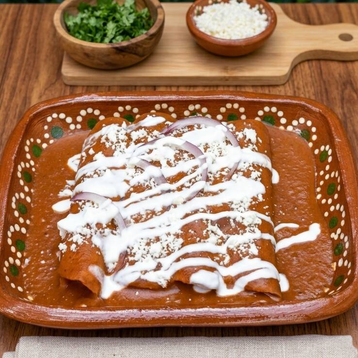 Cuatro enchiladas de maíz nixtamalizado con base de crema de frijol y bañadas en mole veracruzano, con relleno a elegir, queso doble crema y cebolla morada encima.