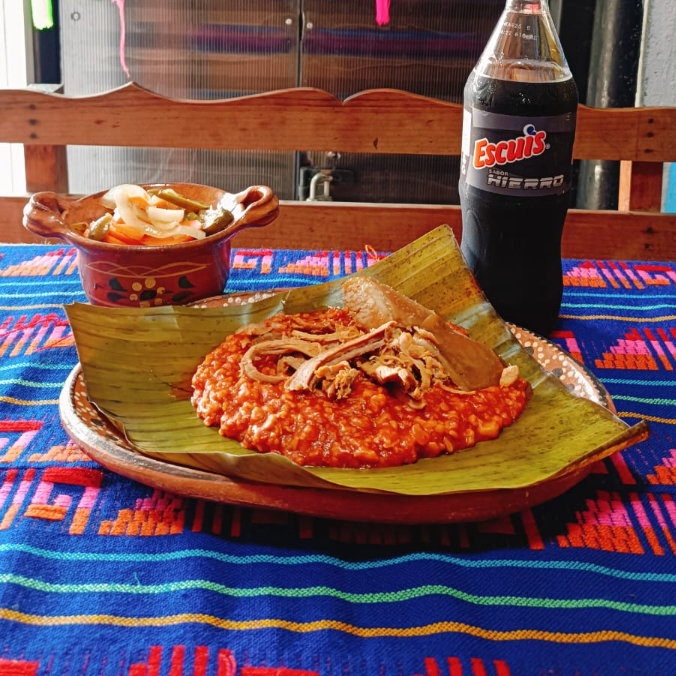 El tradicional y famoso tamal huasteco, acompañado de chiles en escabeches con receta de la casa.