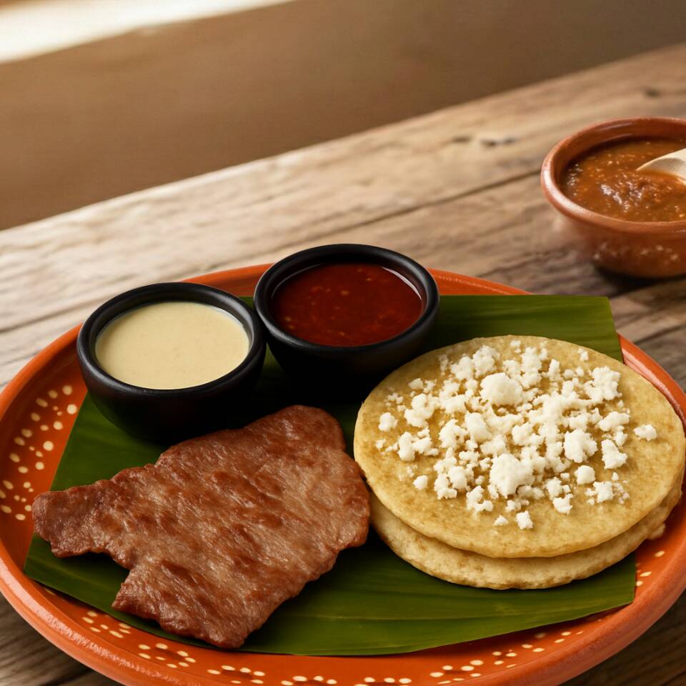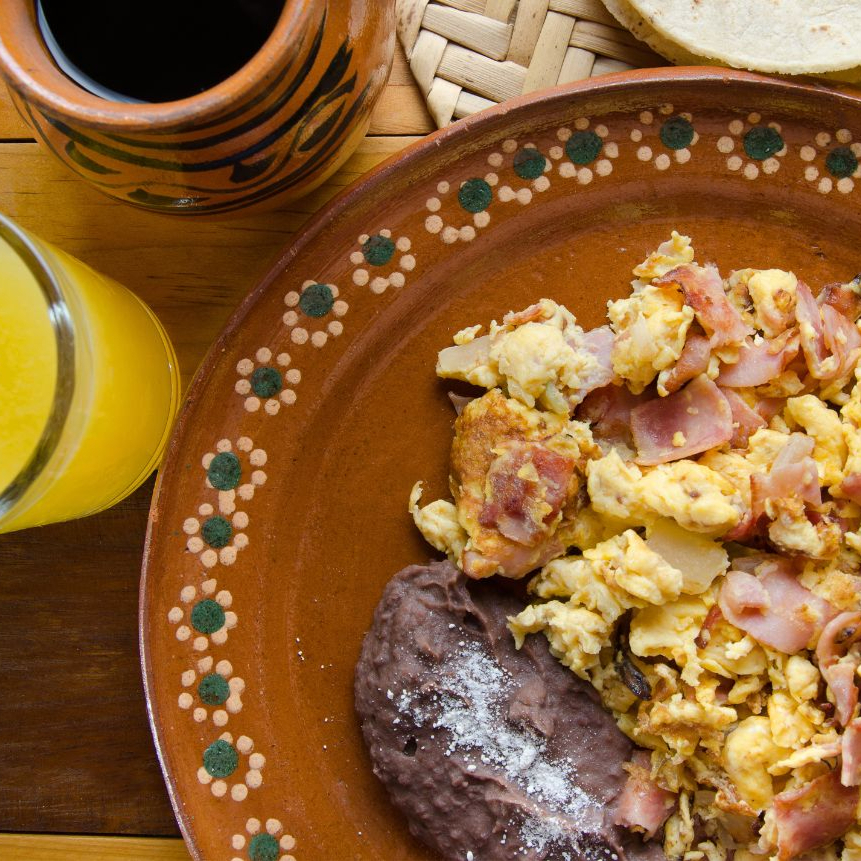 Disfruta 4 tortillas de comal con pipián, chile piquín y queso fresco. Incluye frijoles, salsa de pipián y cecina.