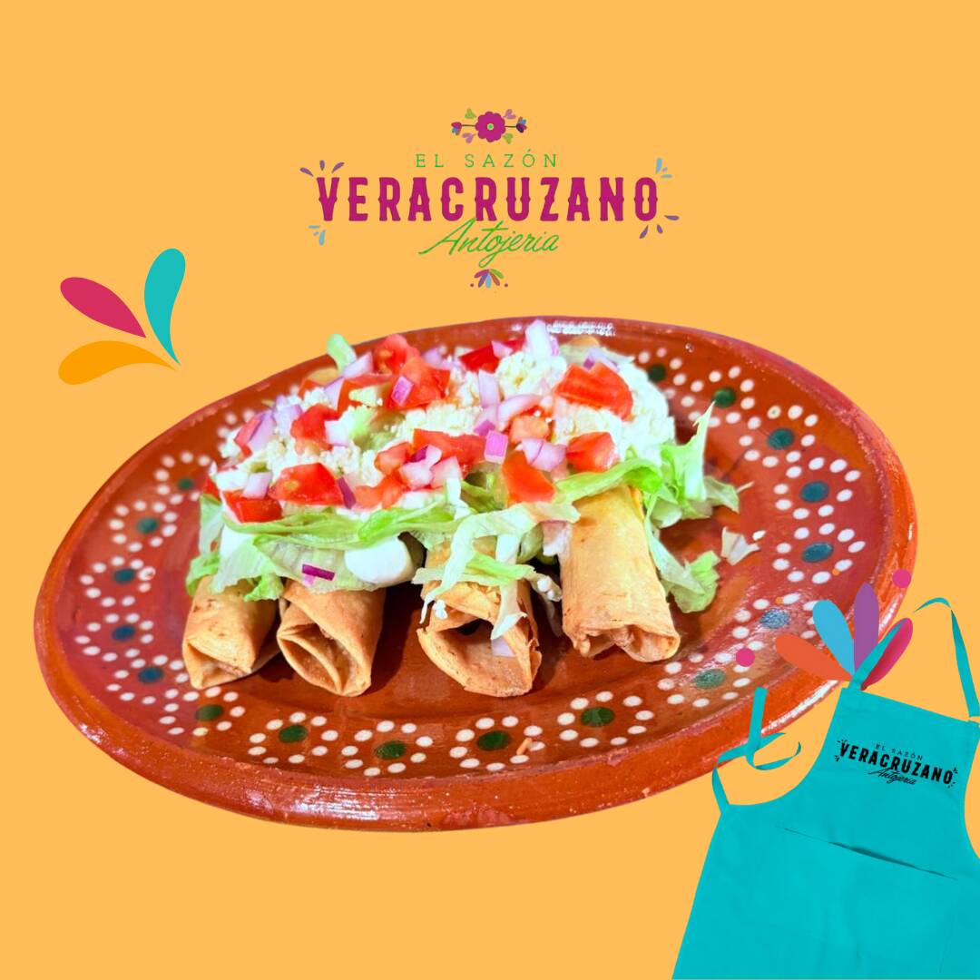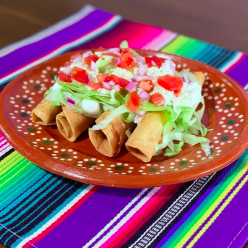 Orden de 4 Tacos dorados acompañados de ensalada (lechuga, cebolla y tomate en cuadritos), crema, queso doble crema, aguacate y salsa.