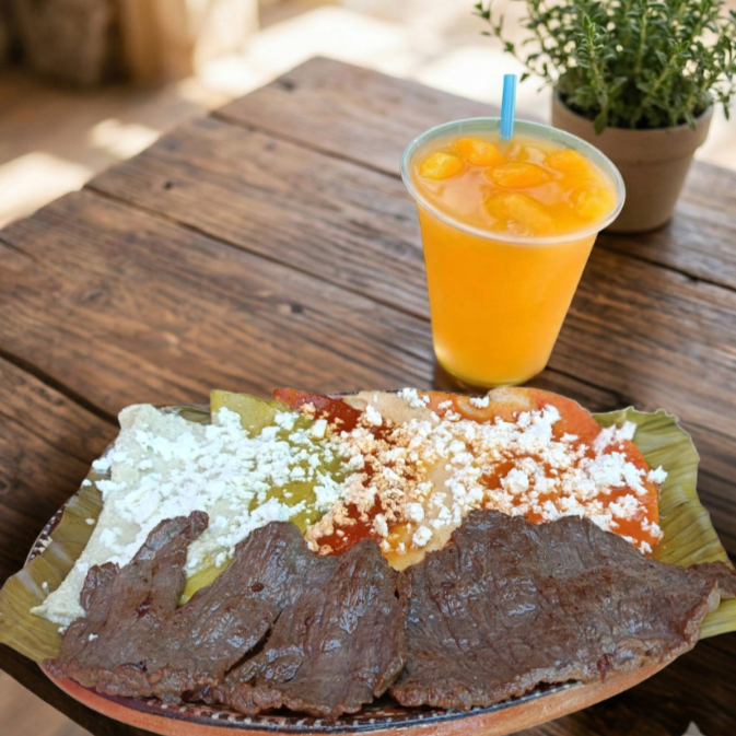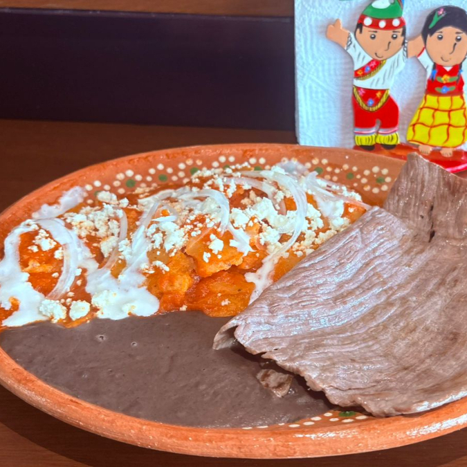 Tortilla cocida en comal estrujada y bañada en salsa y queso, acompañadas con orden de frijoles molidos y refritos.
