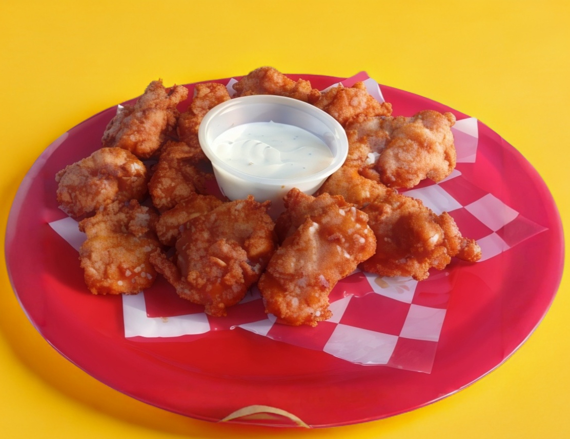 12 piezas de boneless bañados en aderezo de su preferencia acompañado de aderezo ranch