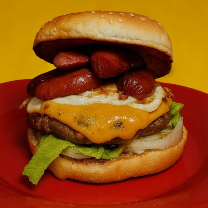 Una hamburguesa con doble queso (americano y de hebra), pan, salchicha de res Kirkland®, aderezo y vegetales.
